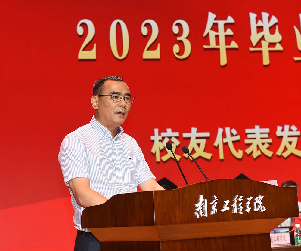 苏州校友联谊会会长、中亿腾模塑科技董事长、英普亿塑胶电子(苏州)有限公司总经理、模具89303班谢海深在发言中向毕业生们表示祝贺,他结合自己的学习、工作经历与感悟,勉励同学们坚定信念,踏踏实实做事、本本分分做人,带着成熟和自信,带着对理想、目标的思考,努力实现自己的人生价值,为强国建设、民族复兴贡献青春力量。