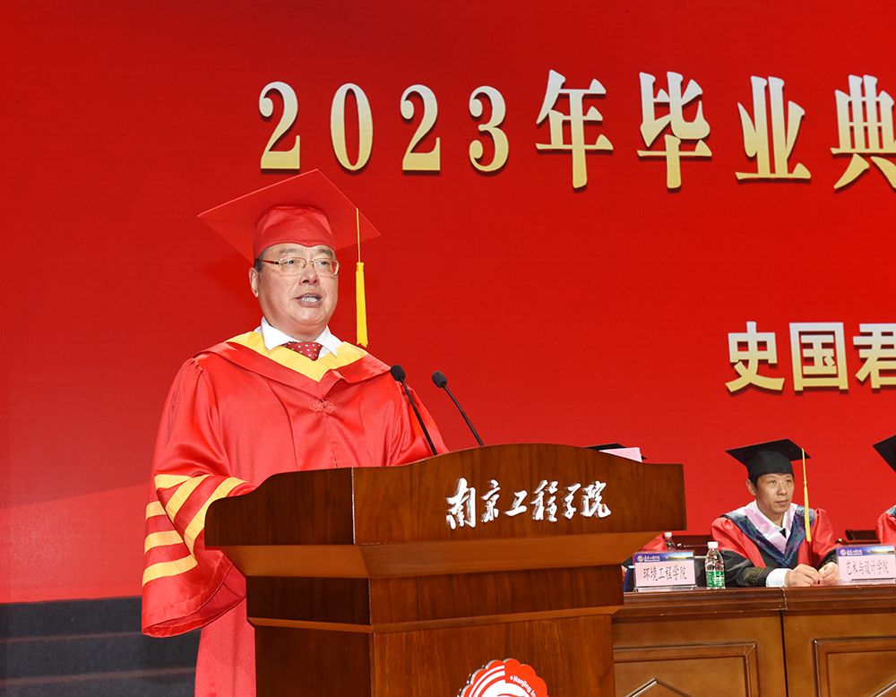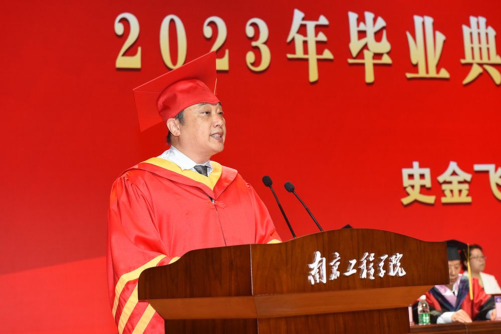 毕业典礼在庄严的国歌声中拉开帷幕。党委副书记、院长史金飞发表讲话,他代表学校向顺利完成学业的本科生、硕士研究生表示热烈祝贺,向悉心培养和关心同学们的老师和家人致以诚挚感谢。史金飞院长说,我们共同经历了新冠疫情防控这场“全民保卫战”,共同见证了新中国成立七十周年、中国共产党百年华诞、党的二十大胜利召开等重要时刻以及学校高质量发展的点点滴滴。“从明天开始,同学们将跨出校门,开启新生活。作为师长,我提三点期望与大家共勉。”史金飞院长希望同学们要树立远大志向,托举伟大梦想,在积极投身中国式现代化伟大实践中实现抱负、建功立业;要坚持以学增智,提升能力本领,通过刻苦钻研,在学习中增长智慧,在实践中增长才干,在工作中练就本领;要坚定守正初心,迈步人生正道,严格约束自己的操守和行为,堂堂正正做人,勤勤恳恳做事,努力攀登人生高地。