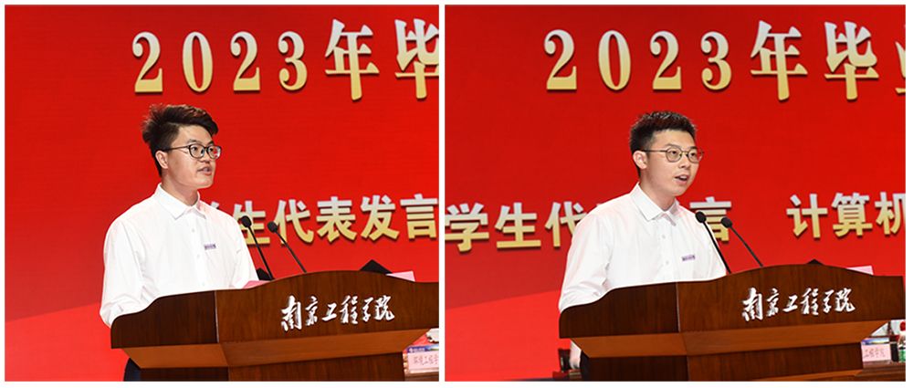 毕业生代表电气工程领域研2006班李飞、计算机工程学院计算机(嵌入)191班陈逸霖在发言中回忆里校园生活的点点滴滴,向精心培育自己的母校和老师、辛勤操劳的父母以及朝夕相处的同窗表达了衷心的感谢,他们表示,将牢记“学以致用”的校训,秉持和传承南工程人的“小我”修养和“大我”情怀,与国家命运紧密相连,与时代强音同频共振,用实际行动表达最诚挚的爱国爱校之情。