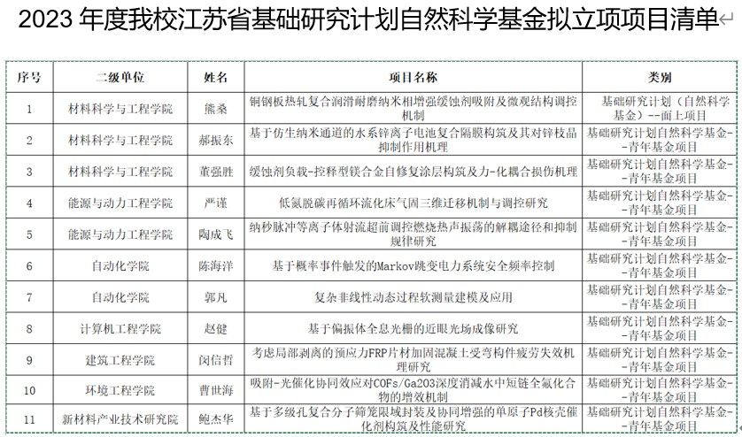 7月19日,江苏省科学技术厅公示了科技计划专项资金(基础研究计划自然科学基金)拟立项项目清单,太阳集团共有11个项目入选,其中面上项目1项、青年基金项目10项,拟立项项目总数居省内同类高校首位。