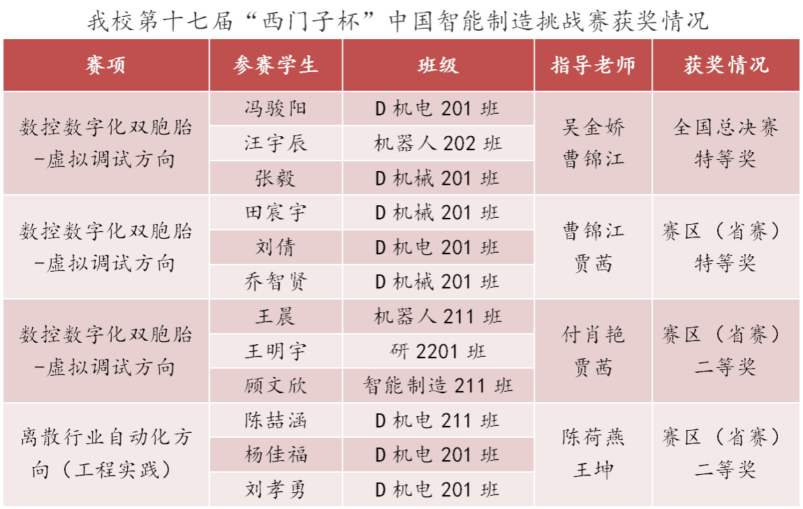 工业中心、创新创业学院对比赛高度重视,连续五年积极组织学生参赛,与自动化学院教师共同组成指导团队,将智能制造新技术引入项目教学,带领学生主动研究规划、反复选拔打磨。最终,共选派5支队伍参加数控数字化双胞胎-虚拟调试、离散行业自动化(工程实践)两个赛项的角逐,获赛区(省赛)特等奖2项、二等奖2项,为总决赛好成绩的取得奠定了基础。