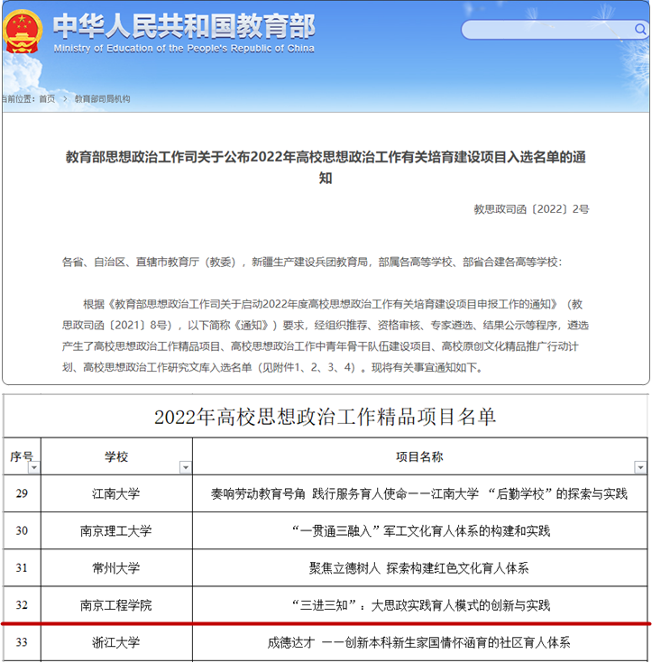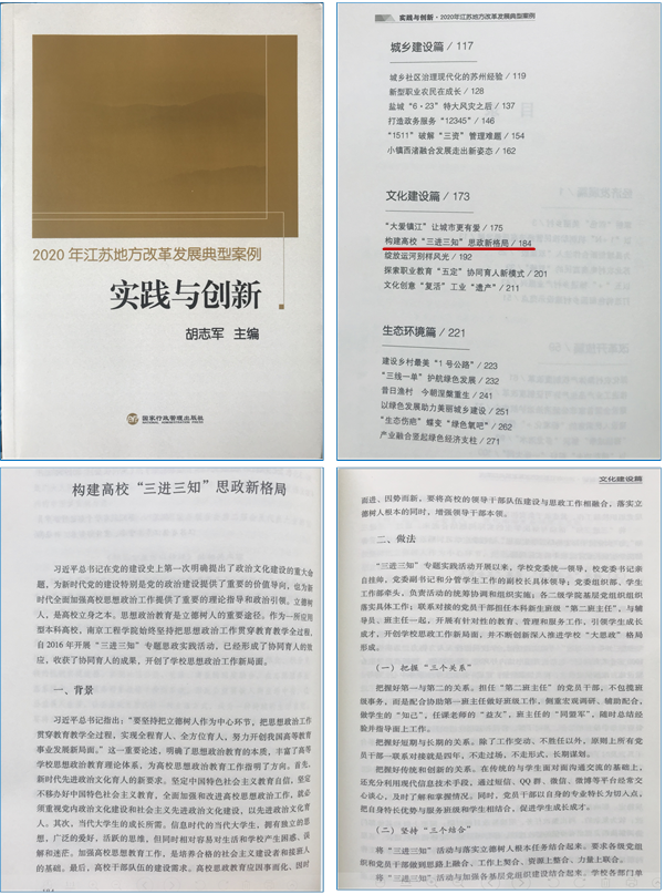 《“三进三知”大思政实践育人模式的创新与实践》项目入选教育部思想政治工作精品项目,成果获评江苏省社科应用研究精品工程奖一等奖,入选江苏地方改革发展典型案例并结集出版。