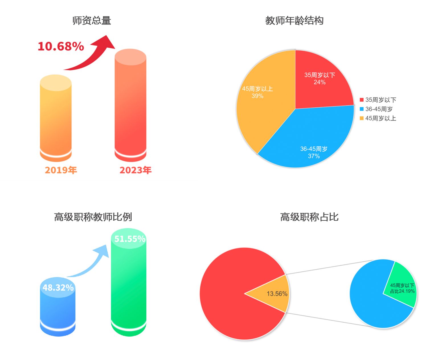 师资队伍结构明显优化。根据学科专业发展建设需要,科学规划师资队伍建设,尤其是注重高层次人才和中青年骨干教师的培养与使用,教师队伍的学历、职称、年龄和学缘结构明显改善,教师总量稳步增长,优势学科和重点学科也形成了良好的学科梯队,师资队伍整体水平稳步提高。五年来,学校师资队伍规模不断扩大,师资总量增长10.68%;中青年教师成为师资队伍主体,年龄结构更趋合理,35岁以下教师占专任教师总数的23.97%,36-45岁教师占专任教师总数的37.16%;教师博士化、国际化程度稳步提高,具有博士学位的教师比例由38.48%提高至48.77%,具有海外经历的教师比例由6.63%提高至9.78%;教师队伍结构更加合理,高级职称教师比例提高至51.55%,正高级职称教师占比13.56%,45周岁以下教授占教授总数的24.19%。