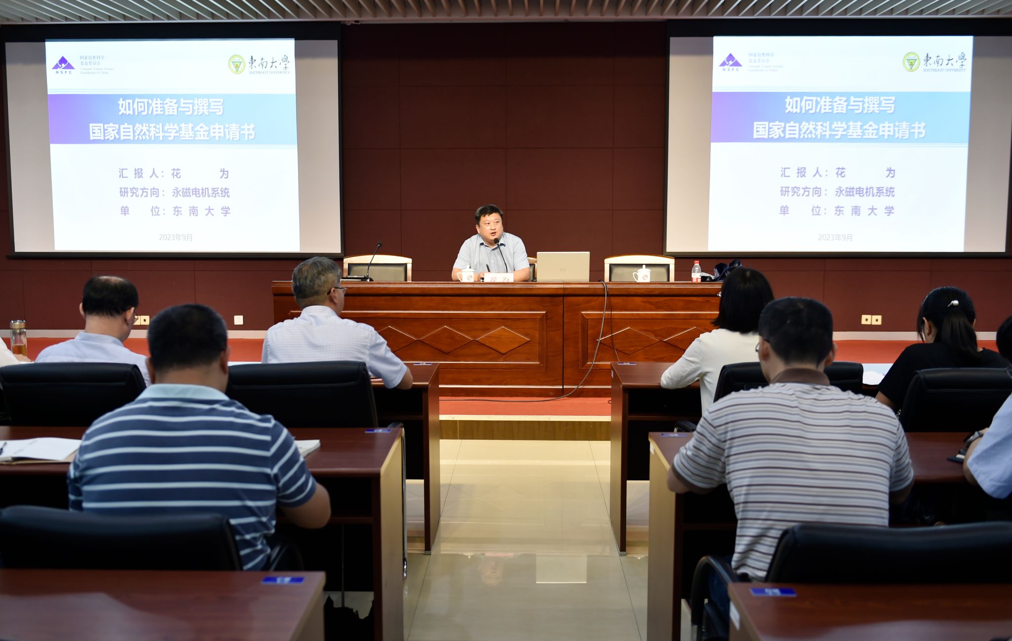 此次会议邀请到国家杰出青年基金获得者、东南大学电气工程学院花为教授作题为《如何准备与撰写国家自然科学基金申请书》的专题报告。他根据自身丰富申报经验,从课题思路来源、课题初步研究、团队组织、题目拟定、立项依据、研究内容、研究方案、可行性、关键科学问题、特色与创新、研究基础、经费预算等方面详细讲解了申请书的准备工作和撰写要点,并从评审专家的视角谈了体会和建议。与会老师受益匪浅。