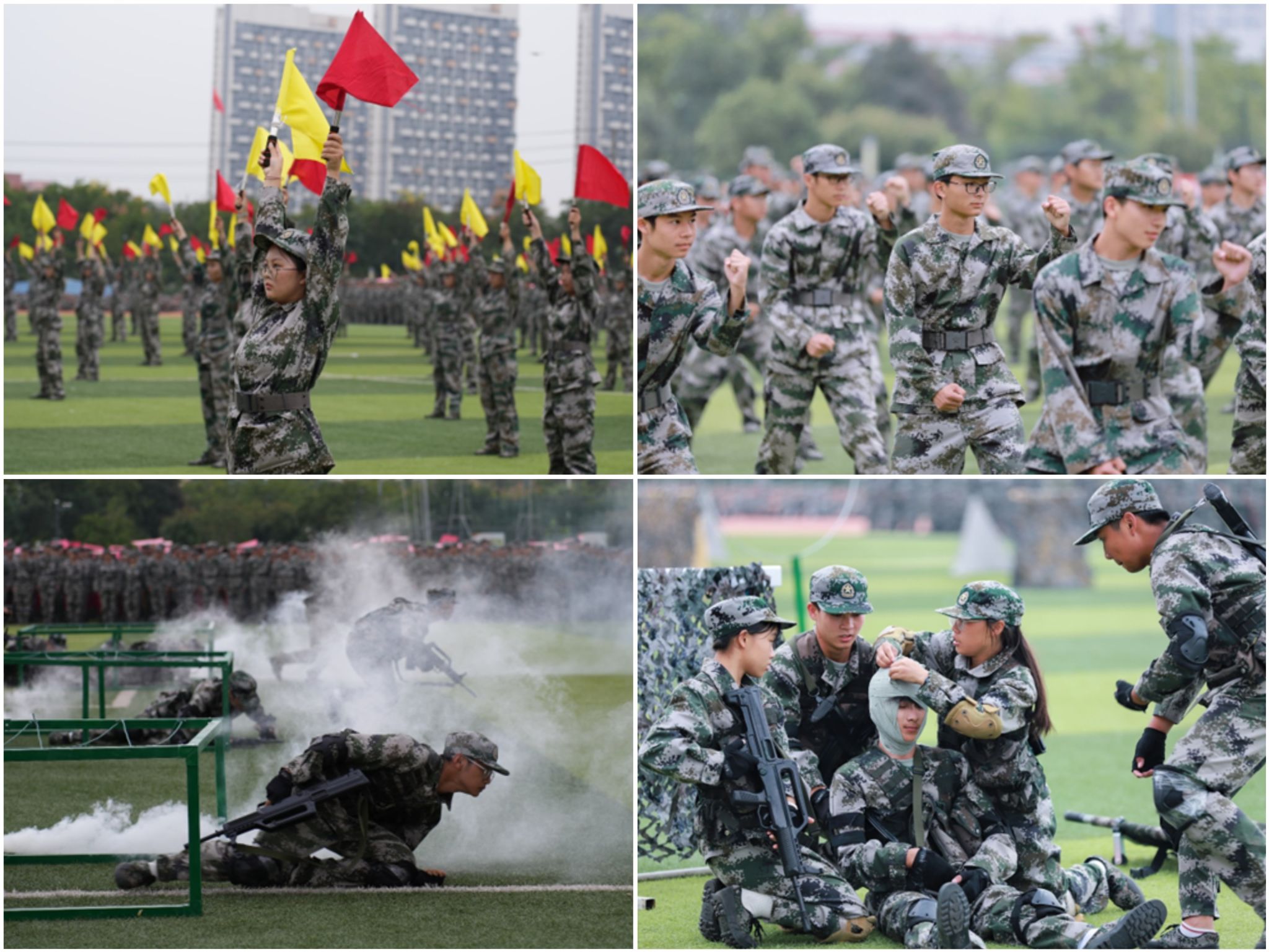 分列式后进行了军训科目汇报。铿锵有力的天印大鼓,有棱有角的内务军被,整齐划一的通讯旗语,步步稳扎的军体拳术,意气风发的匕首操、格斗术、刺杀操、应急棍,以及最后出场的战术方阵,充分展现出南工程学子朝气蓬勃、奋发向上的精神风貌。