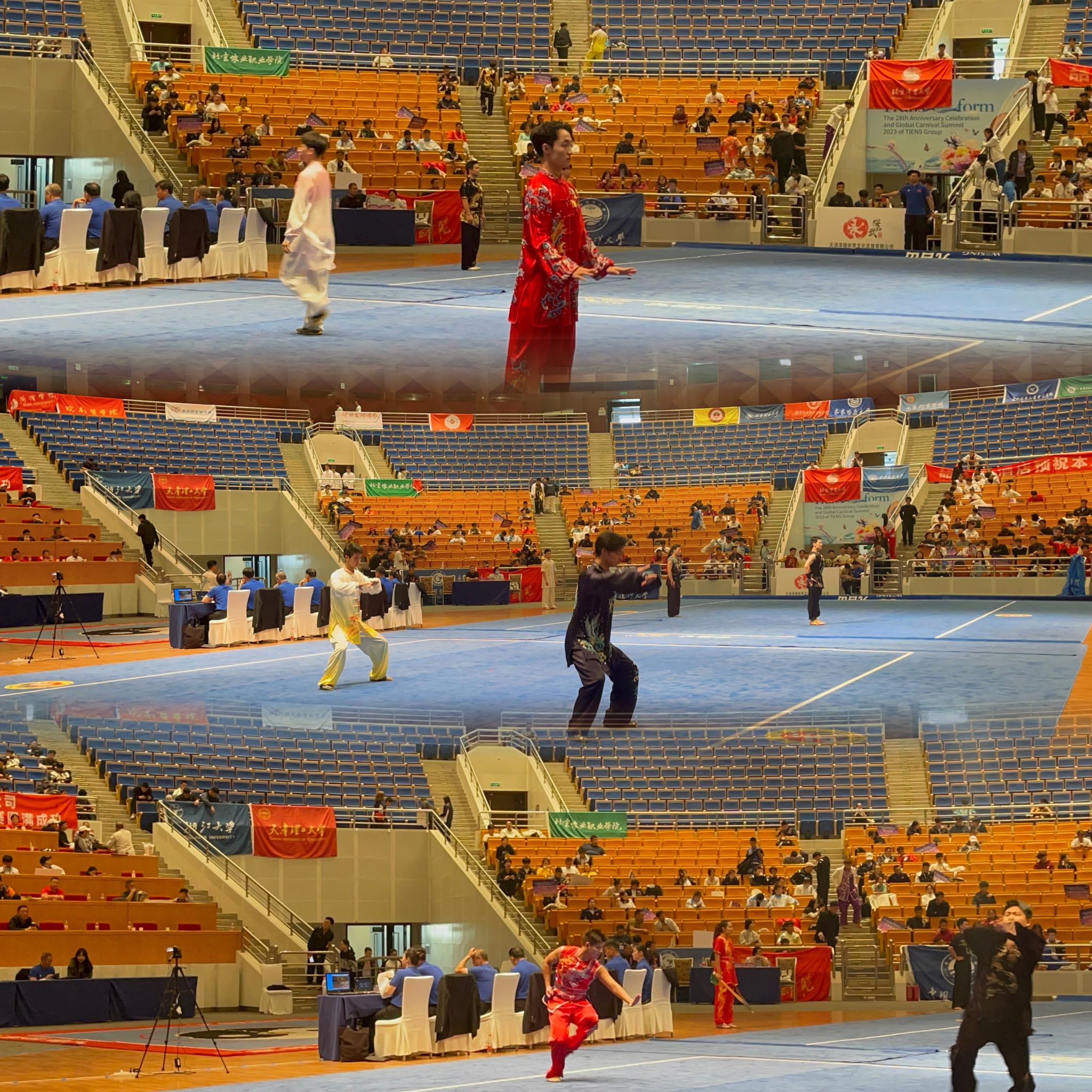 近日,2023年中国大学生武术套路锦标赛在天津市武清区体育中心举行。经过激烈角逐,由体育部马文杰担任领队、孙传晨担任教练,来自机械工程学院徐锦瑞、信息与通信工程学院李思涵、经济与管理学院姚玉林、建筑与工程学院单仁杰、艺术与设计学院王淳、王浩等同学组成的代表队获得1金3银的好成绩。其中,李思涵获通臂拳比赛冠军、42式太极剑亚军,王淳获龙身蛇形太极拳比赛季军,王浩获形意拳季军。