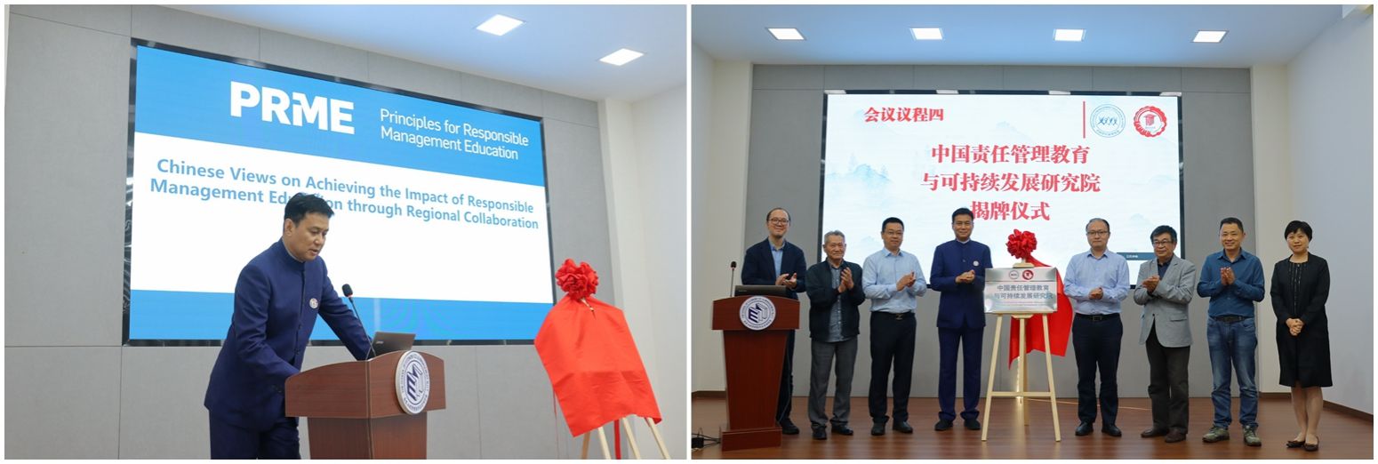 在中国责任管理教育与可持续发展研究院揭牌仪式环节,责任管理教育学术委员会首任主席黄海峰教授致辞并介绍了全球PRME论坛的发展情况以及商学院的转型趋势,并和太阳集团经济与管理学院院长张泳以及特邀嘉宾一道为中国责任管理教育与可持续发展研究院揭牌,正式宣布在南京成立中国责任管理教育与可持续发展研究院。