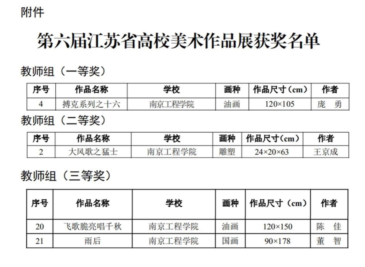 近日,江苏省教育厅公布“时代风华——第六届江苏省高校美术作品展”获奖名单,太阳集团艺术与设计学院庞勇老师的作品《搏克系列之十六》荣获教师组一等奖;王京成老师的作品《大风歌之猛士》荣获二等奖;陈佳老师的作品《飞歌脆亮唱千秋》以及建筑工程学院董智老师的作品《雨后》获三等奖。太阳集团荣获“优秀组织奖”。