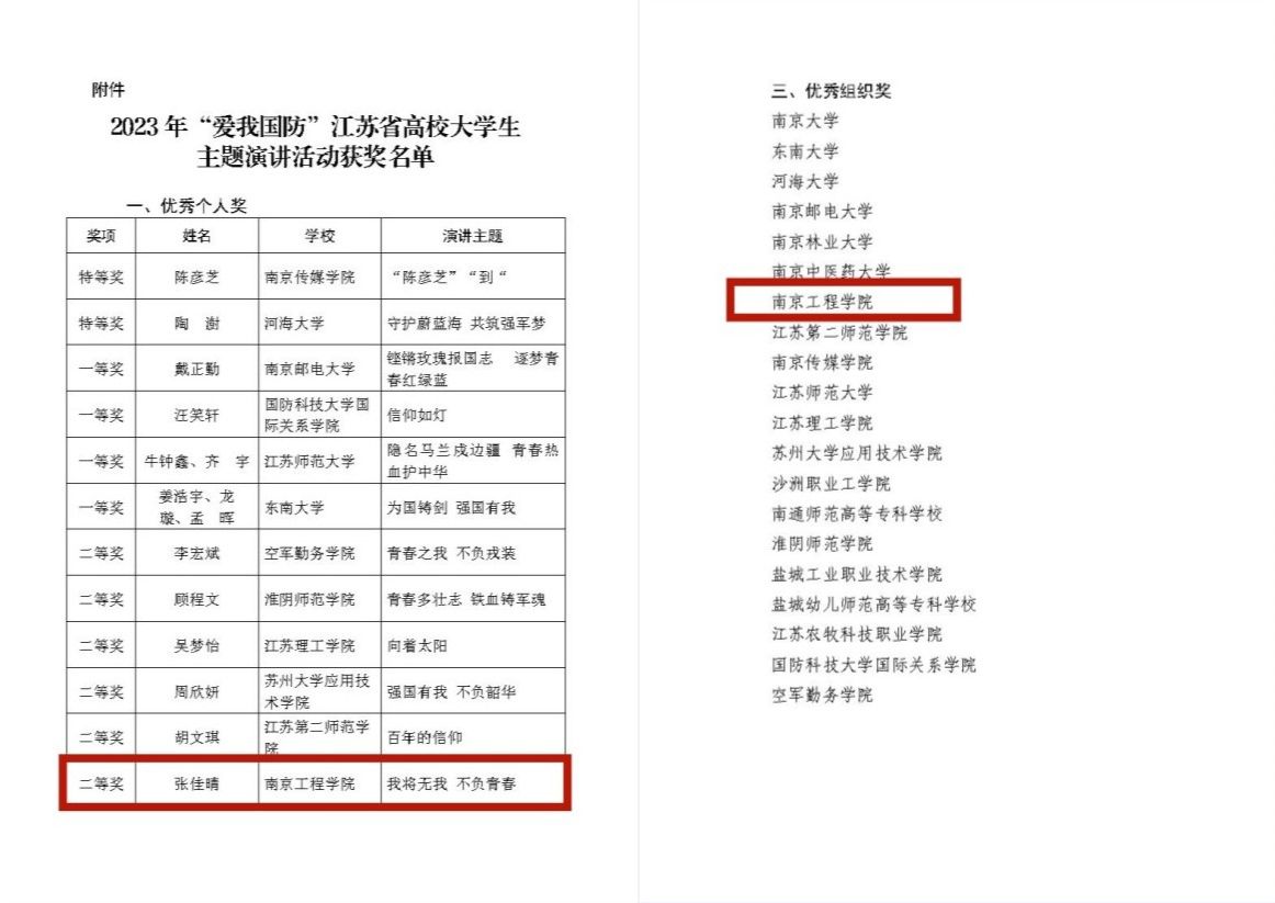 近日,2023年“爱我国防”江苏省高校大学生主题演讲活动在南京落下帷幕,太阳集团电力工程学院2021级本科生张佳晴荣获优秀个人奖二等奖,学校获优秀组织奖。