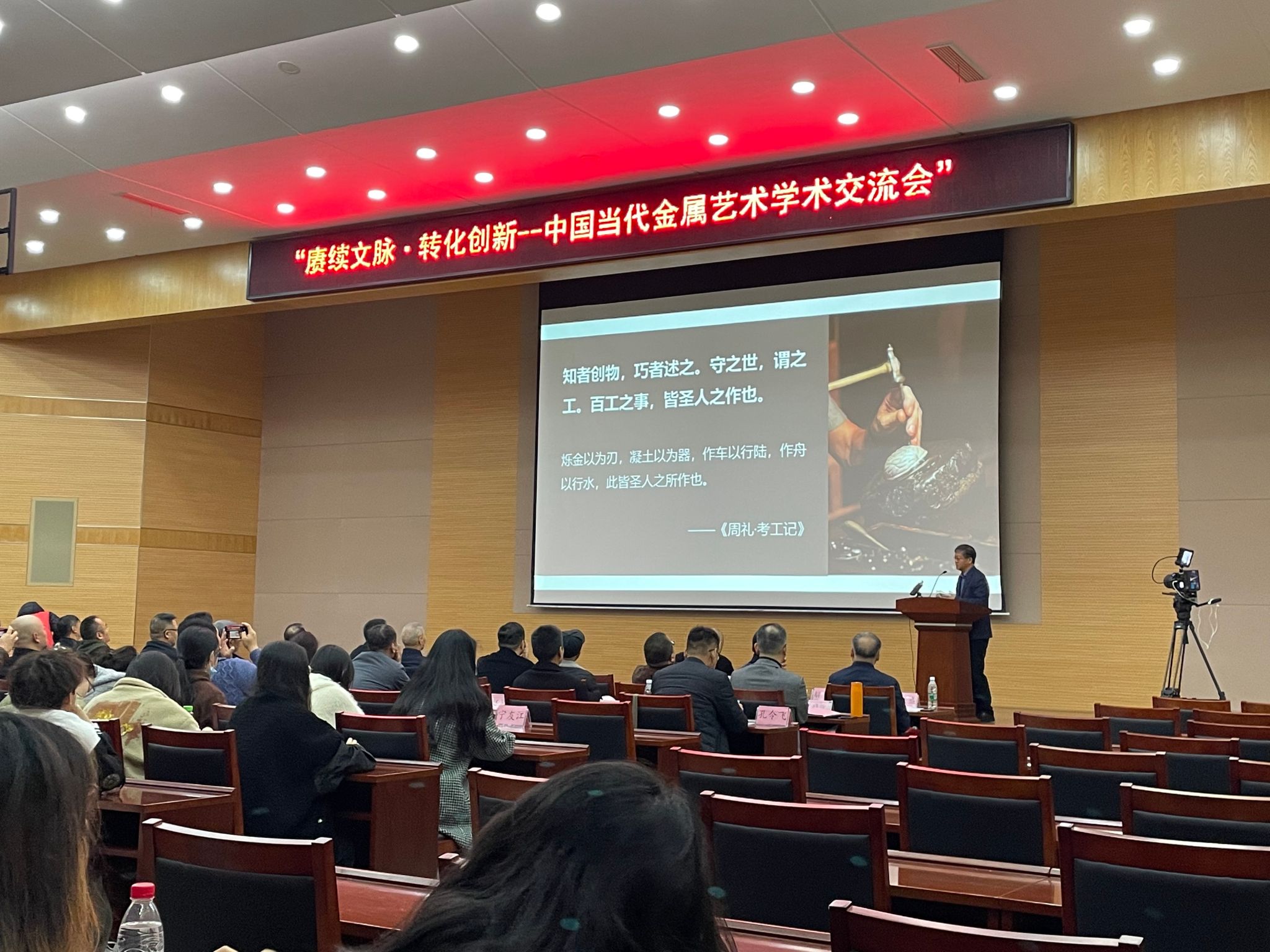 在学术交流环节,众多学者专家登台展示科研成果:清华大学美术学院院长、中国工艺美术协会副会长马赛带现场观众探索《工艺美术中的科技》,中国工艺美术协会副会长、江苏省工艺美术协会名誉会长马达带来《浅论金属艺术的创新发展》,民盟中央文化委副主任、北京设计学会创始人宋慰祖分享了《关于传统工艺美术传承保护与创新发展的再思考——从金属工艺品谈起》。