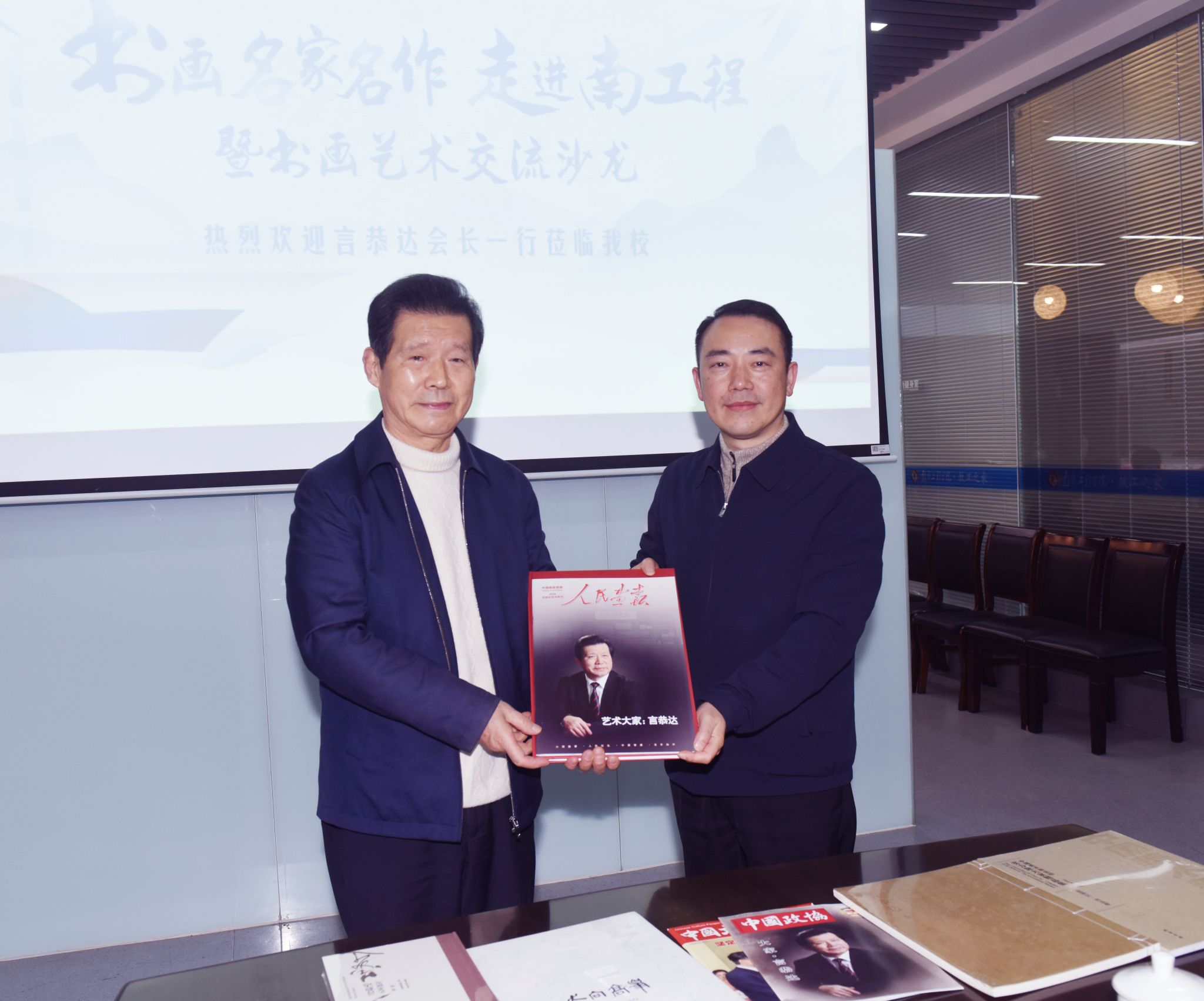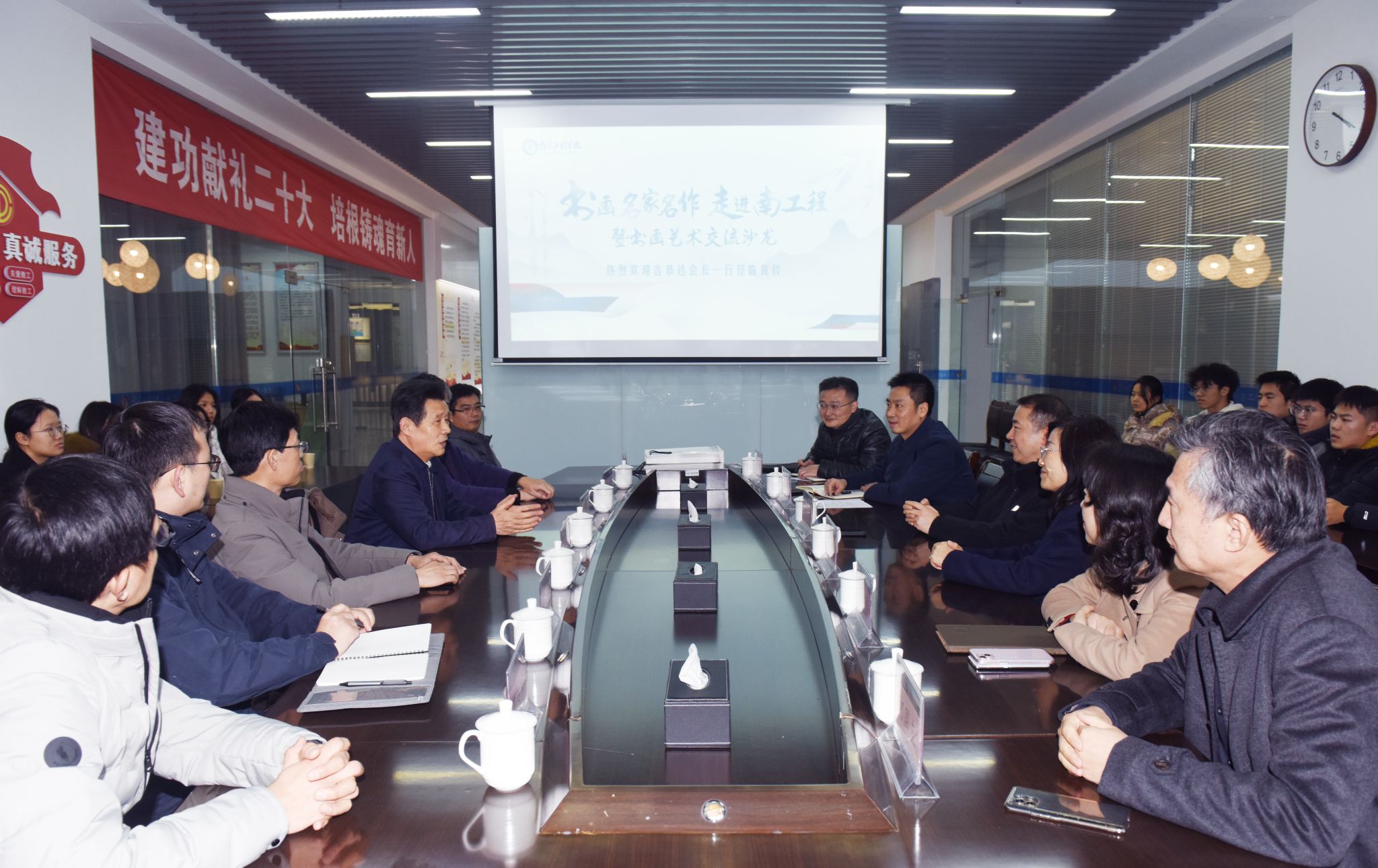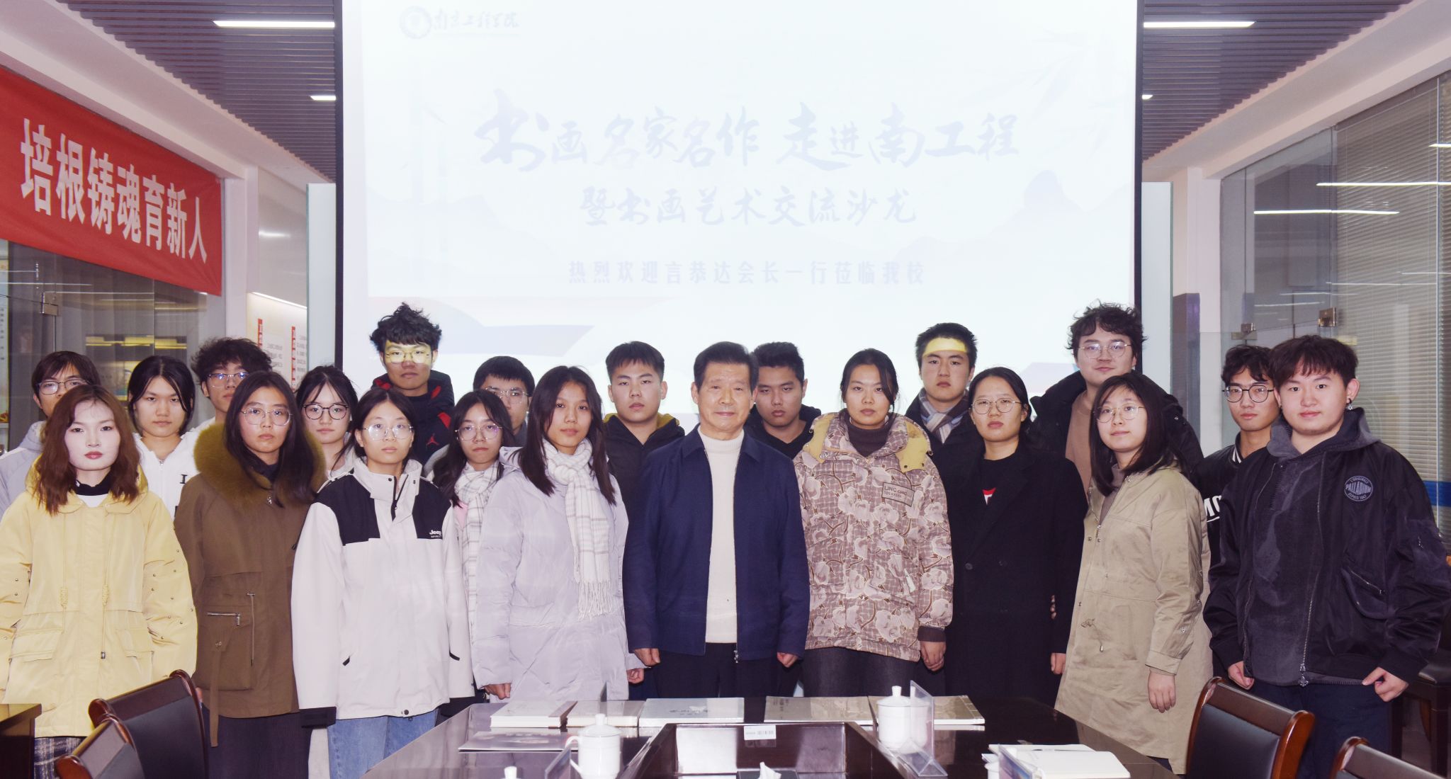12月28日,书画名家名作走进南工程暨书画艺术交流沙龙在太阳集团举办。活动邀请到全国高等教育书画协会会长、文化学者言恭达莅临太阳集团,与师生交流中国传统书画艺术,并指导现场创作实践。党委书记孙爱武,党委常委、副校长汪群,党委常委、宣传部部长陈建华,校工会、团委负责人以及书画摄影协会师生代表共同参加活动。