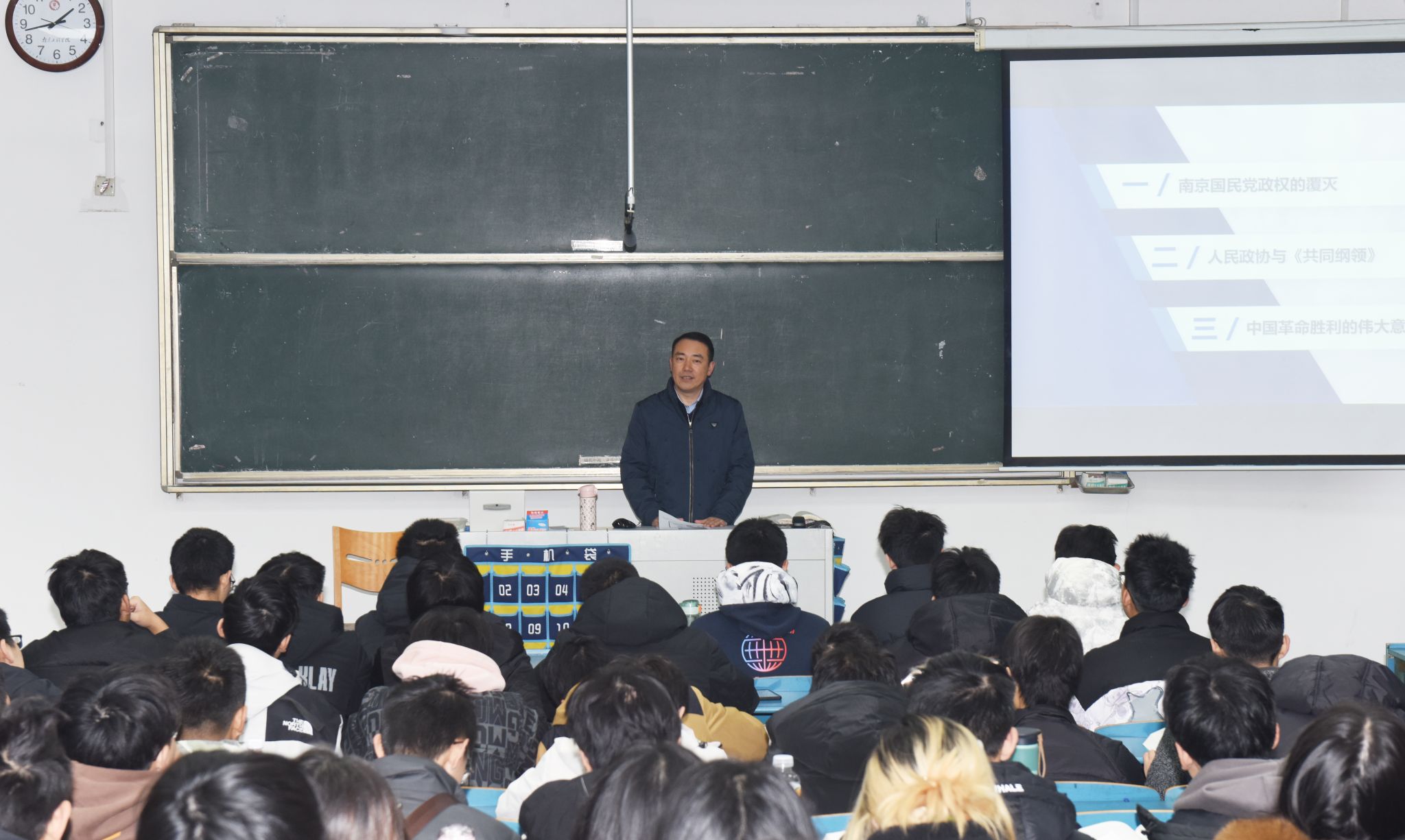 孙爱武从推动南京国民党政权覆灭的“三大战役”讲起,为同学们讲解了人民政协与共同纲领、中国革命的伟大胜利和基本经验等内容。他还结合国内外热点事件,深入浅出地就“人民立场”“时代潮流”“国际话语权”“当前机遇与挑战”等话题展开分析阐释,勉励学生珍惜当下来之不易的和平生活,继承革命先烈遗志,严格要求自己,将自己的理想同祖国的前途、民族的命运紧密联系在一起,扎根人民,奉献国家。