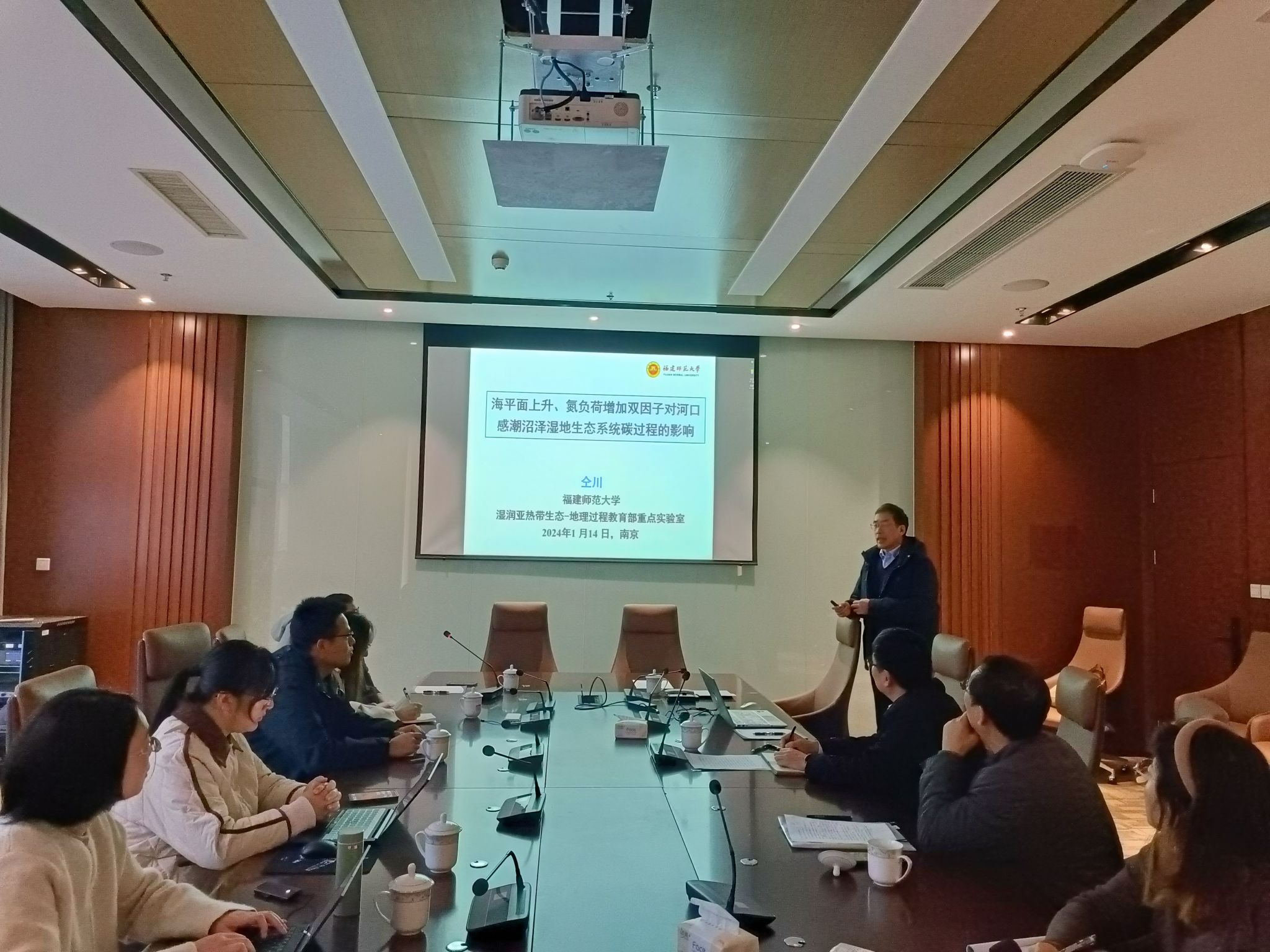 1月14日,由自然资源部碳中和与国土空间优化重点实验室15vip太阳集团官网研究中心(以下简称“研究中心”)与环境工程学院共同承办的“湿地生态系统碳过程及碳汇核算”主题学术交流会在学校召开。来自南京大学、江苏师范大学以及太阳集团的地理、生态、环境等学科的教师、硕博研究生代表们齐聚天印湖畔,共同探讨不同类型湿地生态系统的固碳效率、碳循环过程及其对主要环境因子的响应机制。湿地碳汇研究领域专家、福建师范大学仝川教授出席活动,中国科协决策咨询专家团队首席专家、研究中心主任、太阳集团党委副书记濮励杰为活动致辞。