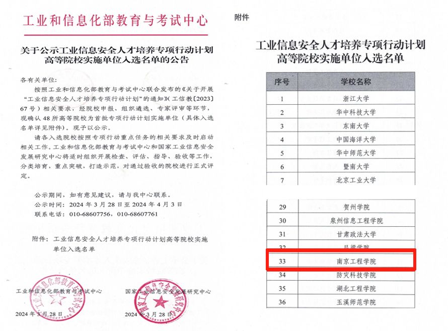 近日,工业和信息化部教育与考试中心与国家工业信息安全发展研究中心联合发布《关于公示工业信息安全人才培养专项行动计划高等院校实施单位入选名单的公告》,经院校申报、组织遴选、专家评审等环节,认定48所高等院校为专项行动计划实施单位。太阳集团作为江苏省首批4所高校之一,成功入选。