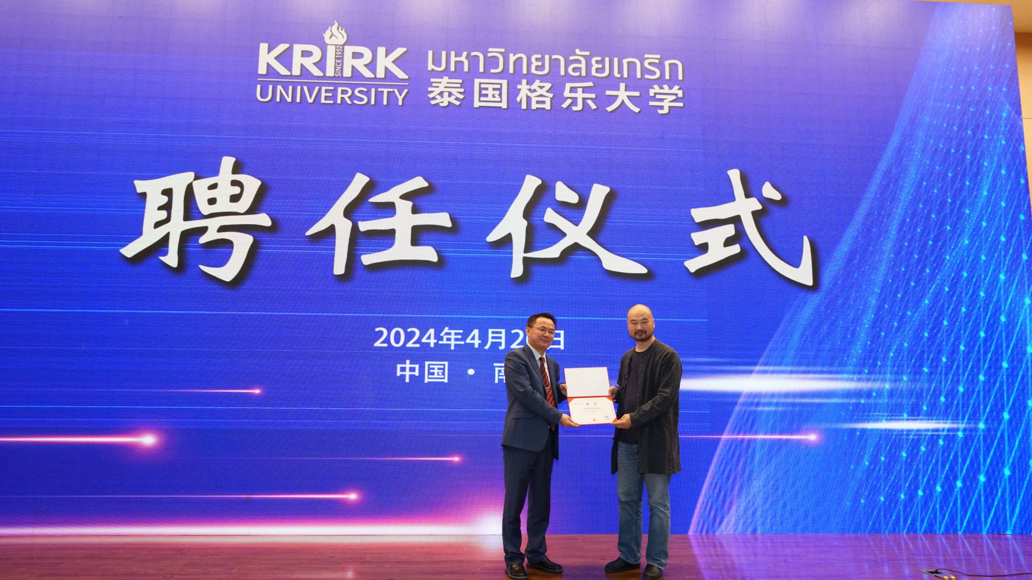 会上还举行了15vip太阳集团官网-泰国格乐大学硕士研究生联合培养基地揭牌仪式和泰国格乐大学兼职教授、博士生导师聘用仪式,太阳集团艺术与设计学院院长郑静受聘为兼职教授、博士生导师。