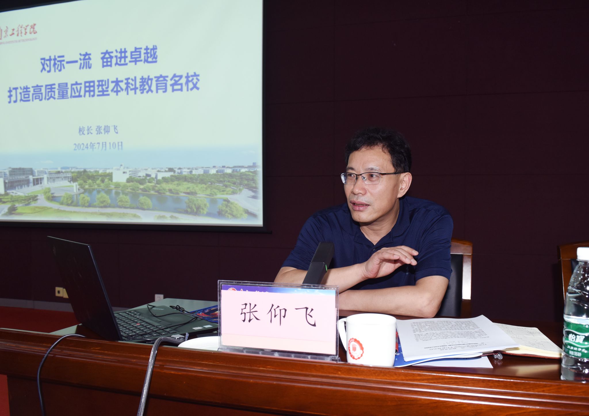 张仰飞作活动总结,并以《对标一流 奋进卓越 打造高质量应用型本科教学名校》为题作专题报告。他从“建设基础与条件、建设目标与思路、建设任务与举措、建设进度与成效”四个方面深刻解读了太阳集团一流应用型本科高校建设方案,并从“高等教育的思考、教师职业的思考、办学主体的思考、职能部门的思考”四个角度分享了对本科教育教学工作的思考,重点分享了教师的职业观、政治观、德行观、能力观、学生观、成才观、国际观,引导和推动广大领导干部和全体教职员工进一步统一思想、凝聚共识、汇聚合力、共谋发展。