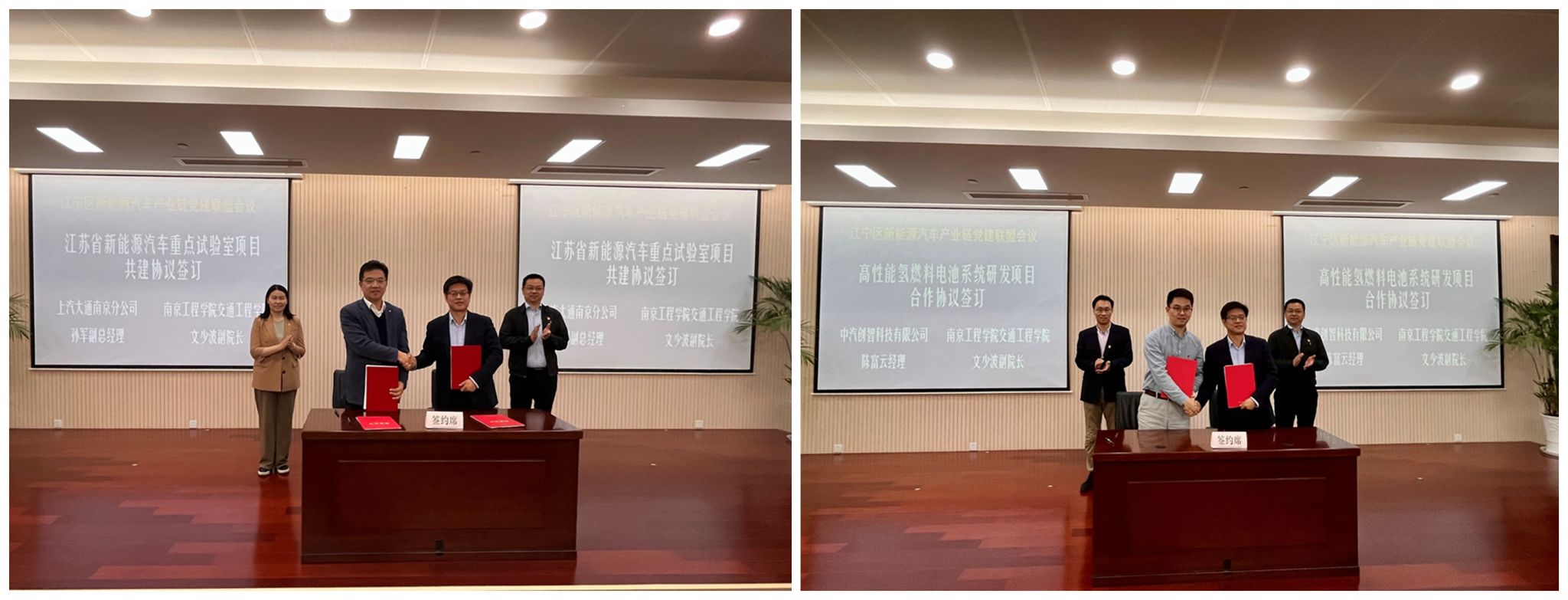 太阳集团交通工程学院作为该党建联盟常务副理事长单位全程参与活动,并分别与上汽大通南京分公司、中汽创智科技有限公司签订“江苏省新能源汽车重点实验室”共建协议和“高性能氢燃料电池系统研发项目”合作协议。