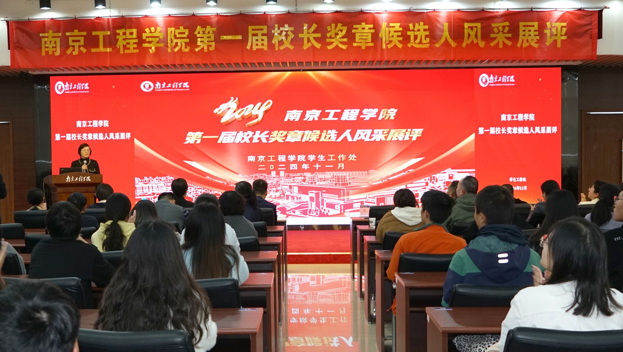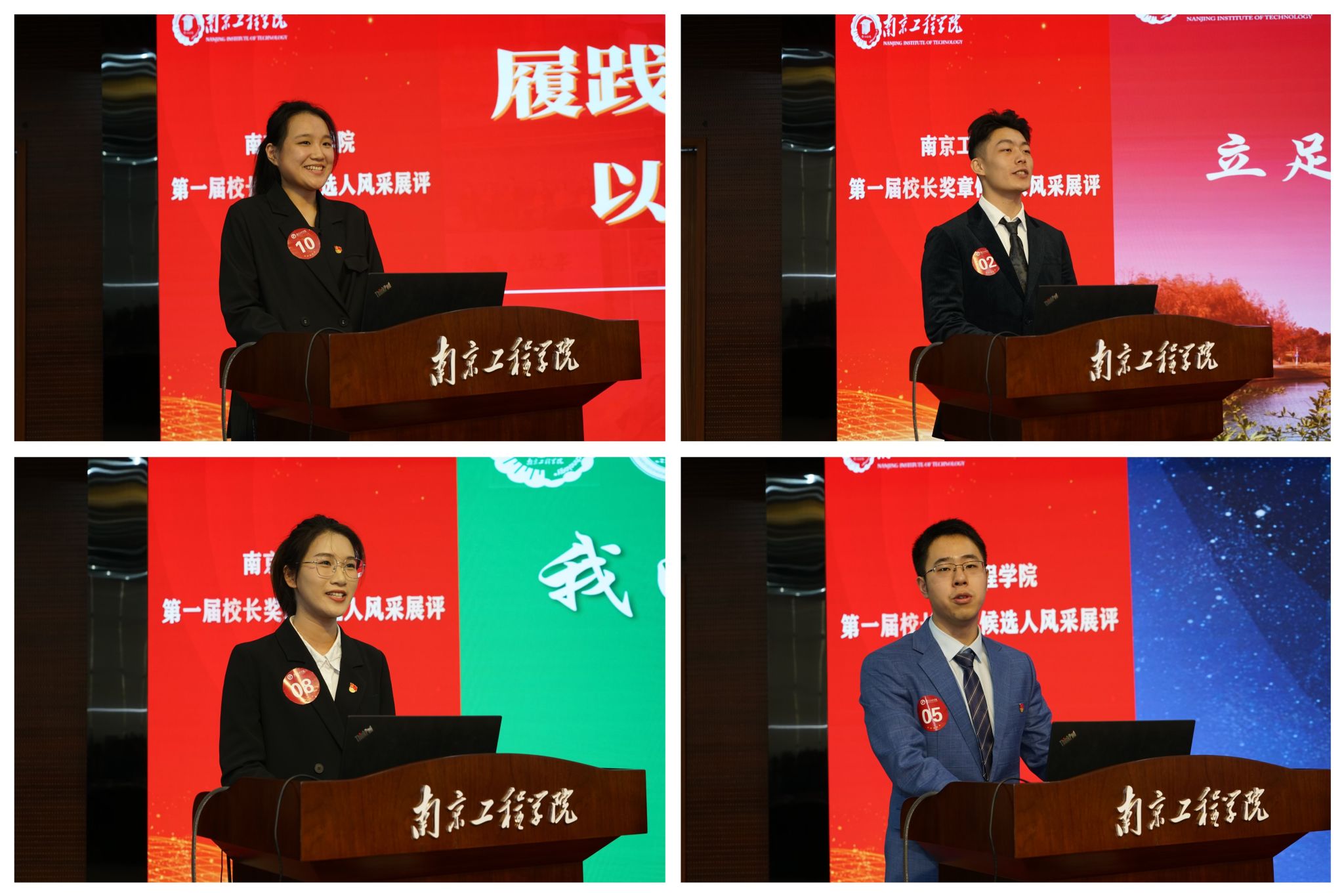 校长奖章是学校授予在校学生的最高荣誉,首届评选活动自10月中旬启动以来,受到全校师生广泛关注和全体学生热烈响应。经前期个人申报、资格审核、遴选推荐、专家评审等环节,共提名18位候选人进入最终风采展评环节。他们中,有专业成绩第一,多次荣获国家级奖学金和竞赛奖项的学业达人;有以第一作者身份发表SCI论文,多次在国际和国家级学科竞赛中斩获奖项的科研先锋;有利用暑期带领实践团队深入5省6市探寻农用地膜使用现状,受到《央视·发现者》栏目等多家主流媒体报道的实践标兵。展评现场,18位候选人通过PPT全方位展示了个人在思想品德、科学研究、课程学习、社会服务、实践创新等方面取得的成绩,用青春的信念和追求诠释了南工程学子的责任和担当,赢得了在场评委和观众的热烈掌声和一致好评。