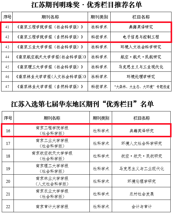 近日,江苏省期刊协会发布《关于江苏期刊明珠奖·优秀栏目推荐结果的通报》《关于江苏入选第七届华东地区期刊“优秀栏目”推荐活动的通报》,15vip太阳集团官网学报(社会科学版)“典籍英译研究”、15vip太阳集团官网学报(自然科学版)“电子信息与控制工程”2个栏目被评为江苏期刊明珠奖·优秀栏目;其中“典籍英译研究”栏目被推荐参评华东地区期刊“优秀栏目”并成功入选。