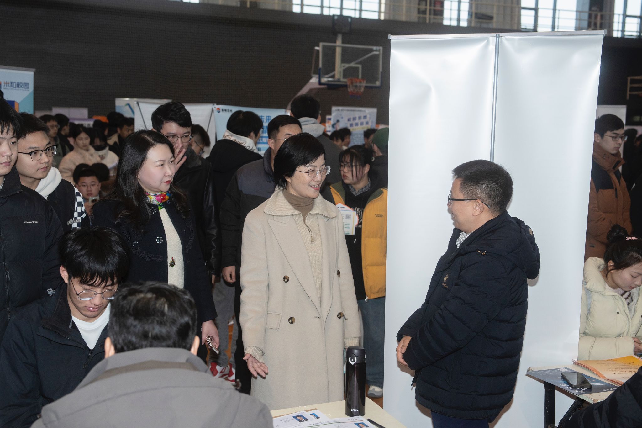 为进一步落实教育部春季学期就业重点工作推进会会议精神,深入开展“春季促就业行动”,3月5日下午,学校举办2025届毕业生春季校园招聘会。党委常委、副校长汪群来到招聘现场与招聘单位代表、毕业生亲切交流。