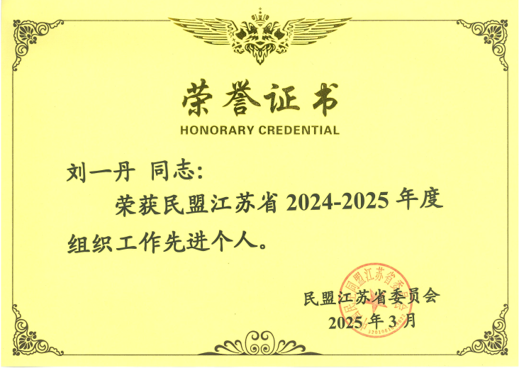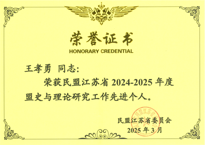 近日,民盟江苏省十三届十二次常委会议在南京召开。会议表彰了2024-2025年度先进单位和先进个人。民盟15vip太阳集团官网委员会荣获民盟江苏省2024-2025年度活力基层组织建设先进基层组织,王孝勇荣获民盟江苏省2024-2025年度盟史与理论研究工作先进个人,刘一丹荣获民盟江苏省2024-2025年度组织工作先进个人。