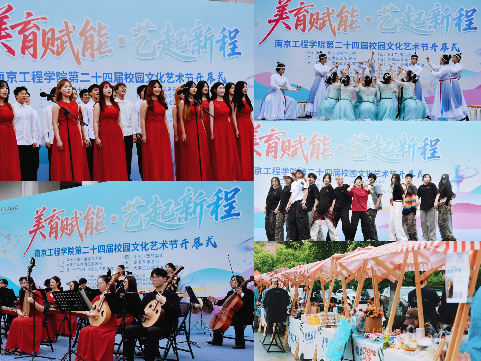 开幕式后开展了多项精彩的文艺活动。在第十二届十佳模特大赛中,选手依次完成统一服装展示、主题穿搭展示和礼服展示三轮比拼,充分展现南工程学子的青春风采与精神面貌;大学生艺术团汇报演出与社团巡礼节开幕式同步举行,涵盖合唱、舞蹈、器乐、语言类等原创节目,整场演出不仅彰显了专业水准,还集中展现了学校美育育人的丰硕成果;NJIT·鹭鸟集市开张,创意手工艺品、非遗作品、特色美食等摊位吸引师生驻足;馋嘴季零食节联合30家国内一线品牌开展试吃、礼品赠送,普及食品安全知识;大学生合唱团则以独唱、合唱等形式带来专场演出,展示2024年度训练成果,让大家在歌声中深刻感受团结与协作的力量。
