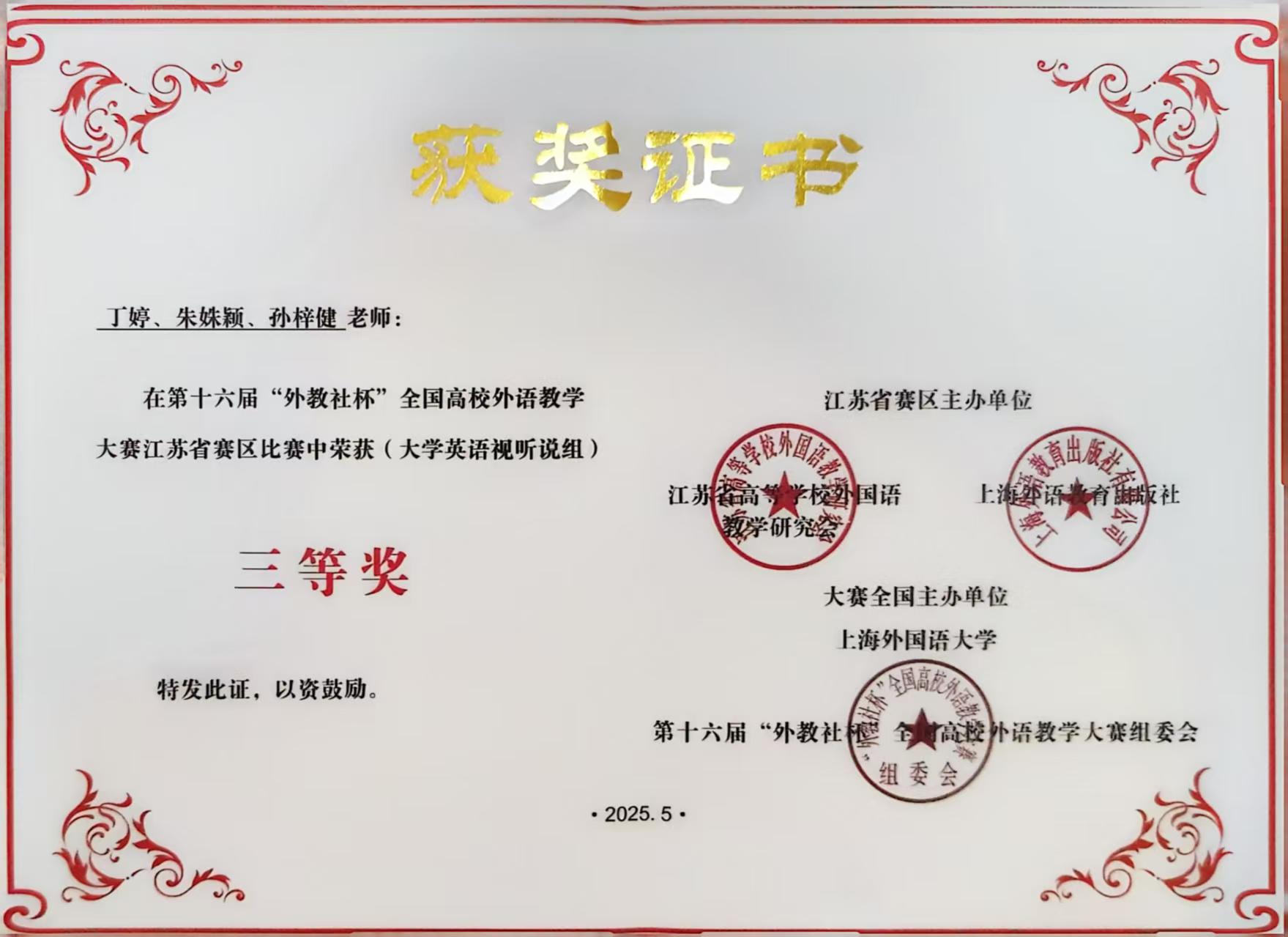 5月16日至18日,第十六届“外教社杯”全国高校外语教学大赛江苏省赛区决赛在泰州学院圆满落幕。太阳集团外国语学院丁婷、刘金龙、汪馨菲、杨浩然所代表的四支教学团队,分别参加大学英语视听说组、大学英语综合组、本科英语专业组和研究生英语组等四个组别的比赛,经过激烈角逐,在大学英语视听说组、大学英语综合组中取得三等奖的好成绩。
