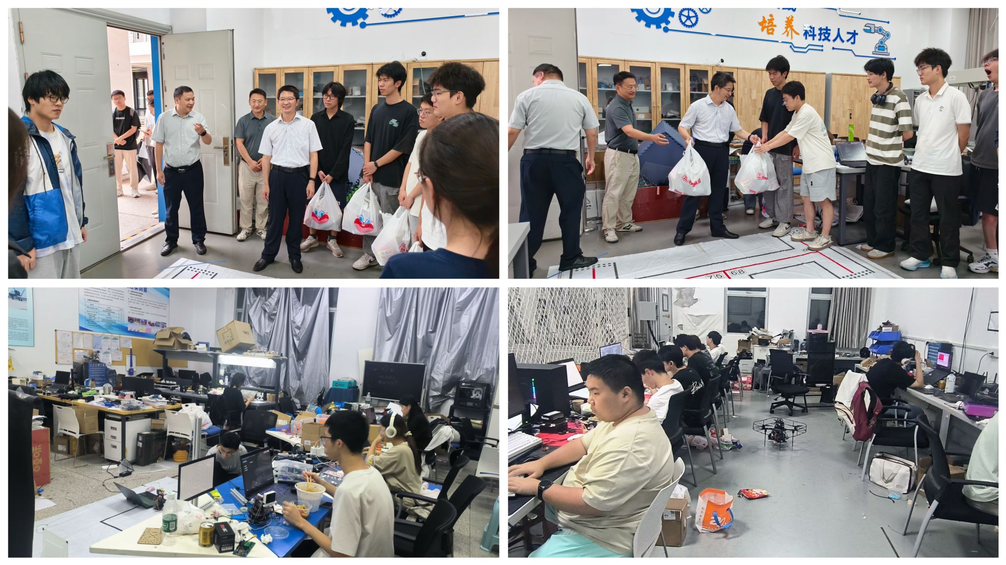 当日正值2025年全国大学生电子设计竞赛江苏赛区比赛时间,该赛事采用四天三夜24小时不间断的比赛赛制,学校共有67个团队、200名同学参赛。在创新创业学院、工程训练中心、应用技术学院负责人的陪同下,朱松青一行深入竞赛现场,仔细查看同学们的工作环境,详细了解竞赛选题、设备调试以及团队协作等情况。实验室中,参赛队员们全神贯注地投入到电路设计、程序编写和系统调试工作中,现场氛围紧张而有序。朱松青驻足观看参赛作品雏形,与参赛团队成员深入交流,关切询问备赛过程中遇到的困难和需求,对同学们展现出的扎实专业功底、创新思维以及团队协作精神给予充分肯定,并叮嘱大家:“连续作战体力消耗大,要多补充营养,注意防暑降温,合理安排作息时间,以最佳状态投入比赛。”