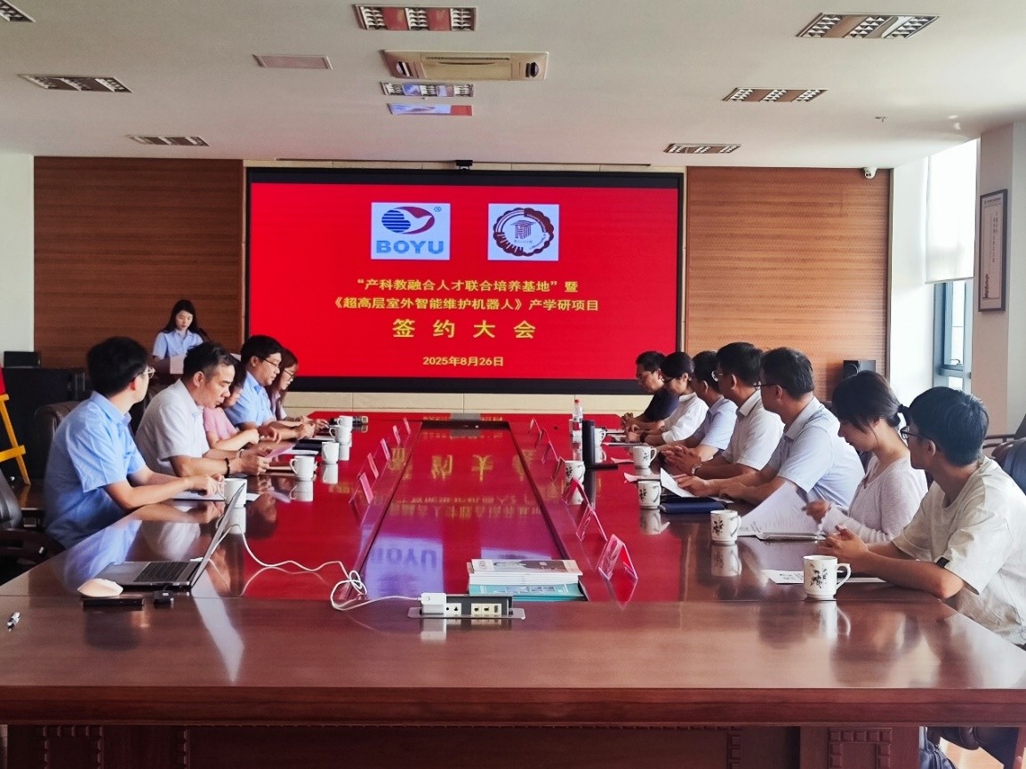 在与会人员的共同见证下,产科教融合人才联合培养基地正式揭牌。校企双方还签署《超高层室外智能维护机器人》产学研项目合作协议,未来将在科研项目、本硕贯通人才培养等方面展开全面合作。