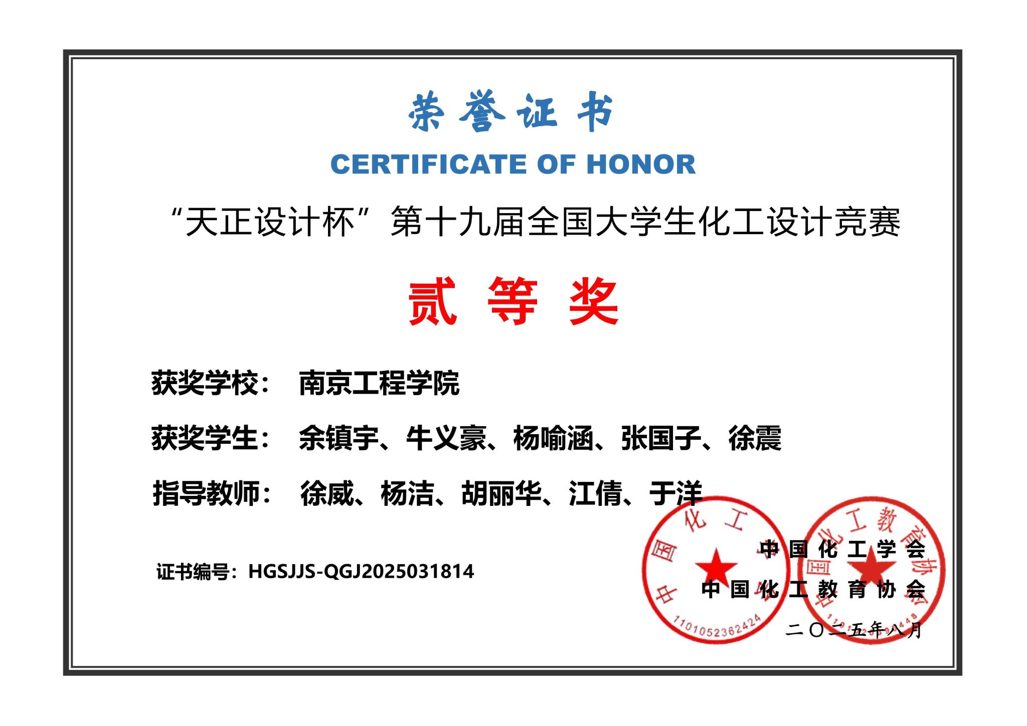 近日,由中国化工学会、中国化工教育协会联合主办的2025年第十九届全国大学生化工设计竞赛落幕。太阳集团环境工程学院选派的队伍(队员:余镇宇、牛义豪、徐震、张国子、杨喻涵)继获得江苏省特等奖、华东赛区一等奖之后,再获全国二等奖;另有3支队伍获得全国三等奖。