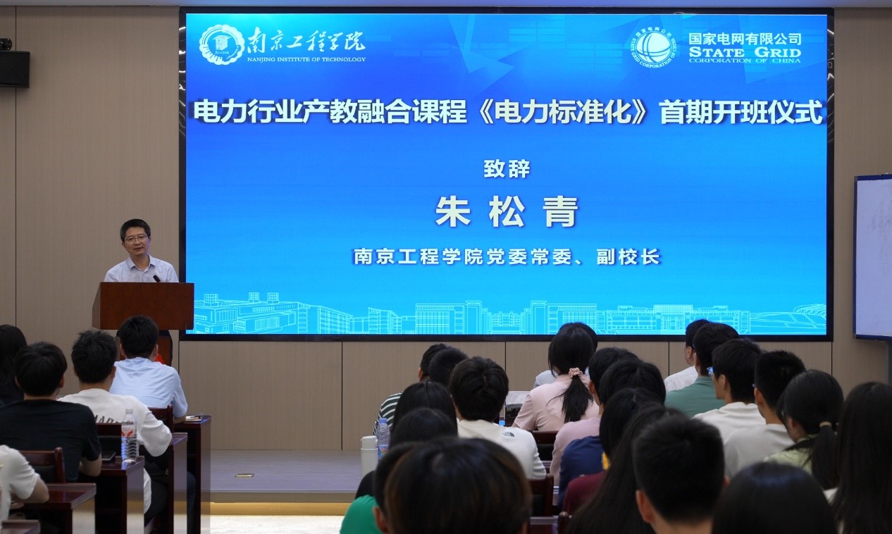 朱松青在致辞中代表学校对国家电网公司和江苏省电力公司的鼎力支持表示感谢,并指出,《电力标准化》课程开班既是响应国家深化产教融合改革的具体实践,也是校企服务电力行业高质量发展的责任担当。就开好这门课,他要求坚持需求导向,优化课程内容;坚持产业引领,深化产教协同;坚持创新发展,强化资源共建。他希望课程团队坚持一流目标,把课程打造成产教融合的典范、人才培养的标杆;希望同学们珍惜机会,主动钻研标准,积极参与实践,培养标准化思维,为投身电力事业、守护电网安全打下坚实根基。