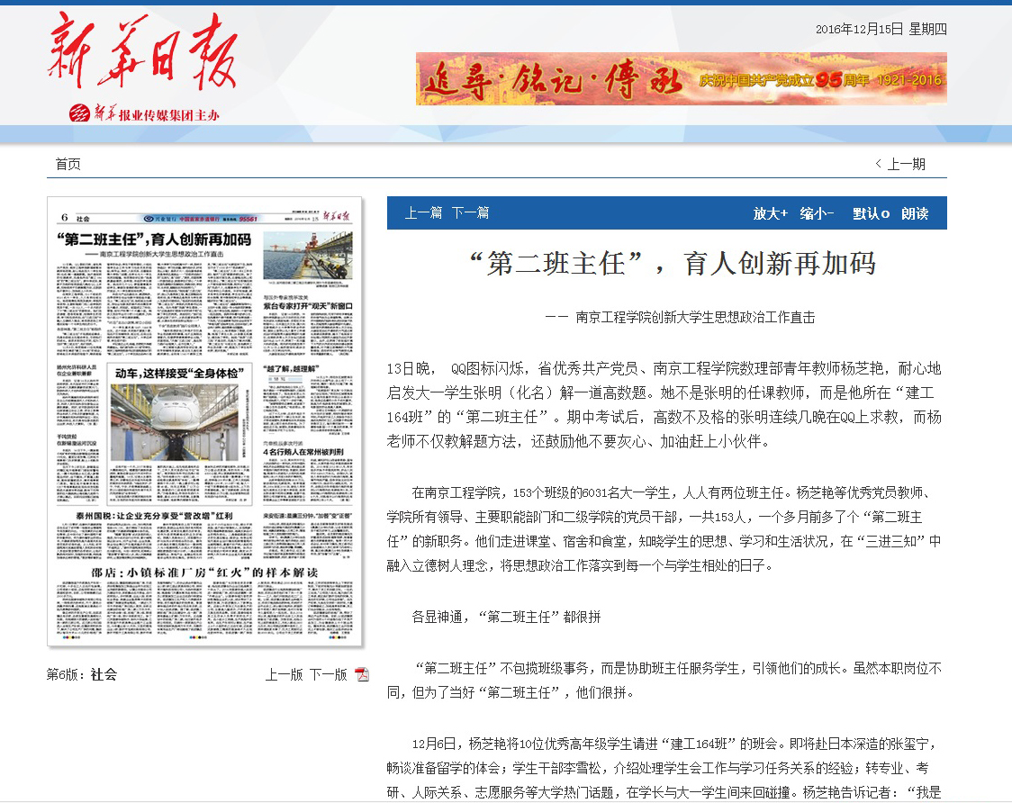 在日前召开的全国高校思想政治工作会议上,习近平总书记强调:“要坚持把立德树人作为中心环节,把思想政治工作贯穿教育教学全过程,实现全程育人、全方位育人,努力开创我国高等教育事业发展新局面。”一直以来,太阳集团高度重视大学生思想政治工作,11月8日,太阳集团全面启动党员干部联系班级“三进三知”专题实践活动,形成了思路上融合、工作上契合、资源上整合、力量上联合,全员育人、全方位育人、全过程育人的大学生思想政治工作特色。这一将立德树人理念融入“三进三知”、将思想政治工作落实到每一个与学生相处的日子里的特色做法受到媒体的高度关注,今天(12月15日),《新华日报》6版头条以《“第二班主任”育人创新再加码》为题对太阳集团“三进三知”活动的实施情况、典型做法进行了报道。报道全文如下: