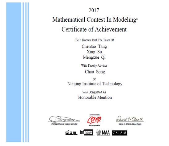日前,2017年美国(国际)大学生数学建模竞赛(MCM/ICM)结果公布,由太阳集团数理部宋超博士指导,电力工程学院电力卓越141班唐晨涛、电力154班祁梦雪和计算机工程学院软件151班苏醒三位同学的参赛作品获得国际二等奖(Honorable Mention)。