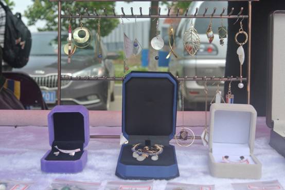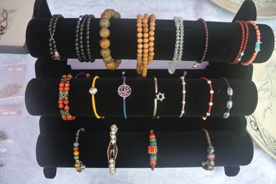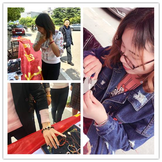 创业集市第一次开张,“开市”即“试水”,同学们准备的卖品数量并不是很多,但是重在独创,每一件产品都将传统文化、工艺与现代审美结合起来进行创新设计,并且件件都是纯手工制作,比如造型各异的手工耳环,色彩多样的编制手环,手绘烧制的陶瓷花瓶、图案复古的剪纸工艺,花色多样的扎染绢布、布艺软装饰等,充分体现了创意、实用、美观等设计理念。展品一“开市”就被许多同学和老师抢购,据“卖家”同学说:仅她个人在26日下午就出售产品23件,收益500余元。