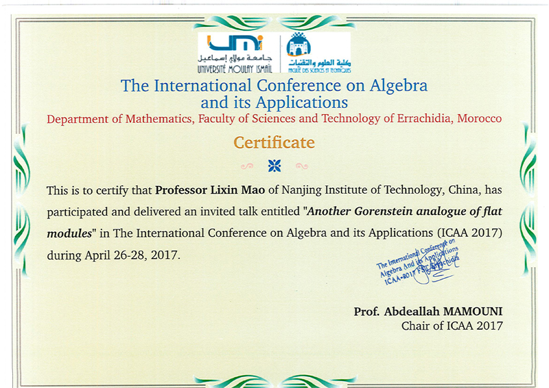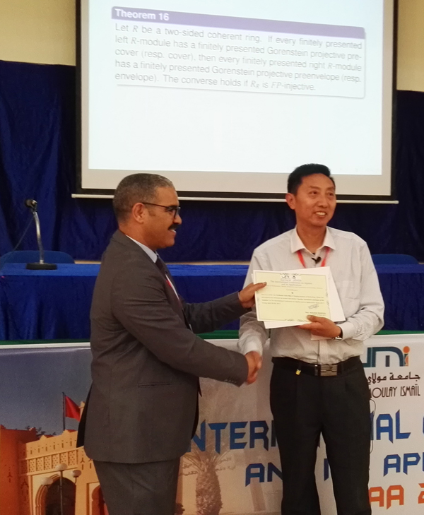 4月26日,国际代数学及应用学术会议(ICAA)在摩洛哥穆莱伊斯梅尔大学开幕。应会议组委会主席、穆莱伊斯梅尔大学数学系Abdellah Mamouni教授邀请,太阳集团数理部毛立新教授参加了本次会议,并做了题为《Another Gorenstein analogue of flat modules》的大会邀请报告。他在报告中首次提出了glat模的概念。作为平坦模在Gorenstein情形下的另一种推广,毛立新教授证明了glat模类具有很好的封闭性质和相对同调性质,并得到了glat模和经典的Gorenstein平坦模的内在关系,同时给出了一些应用。这一最新研究成果引起了与会者的浓厚兴趣,报告结束后不少学者与毛立新教授进行了广泛深入的交流。