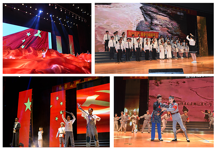 大气磅礴的音诗画《你是一面旗帜》为整场演出拉开了帷幕;九三学社春之声教授合唱团和太阳集团学生们共同演唱的大合唱《保卫黄河》,慷慨激昂,形象地刻画了游击健儿为保卫黄河、保卫全中国而战斗的壮丽场景;舞台诗《热血忠魂》向观众们展现了共产党人的大无畏精神和革命情操;《过雪山草地》、《映山红》再现长征情景,弘扬长征精神;创作歌舞《红军老妈妈》以一颗红心表达了坚定的爱国情怀;《红军哥哥你慢走》充满红色记忆,仿佛把人们带回那红色的年代,让更多的人记住红色的井冈山,记住许许多多为革命献身的红军先烈;舞蹈《茉莉花与新四军》在轻柔中透出一丝红色的历史;京剧片断《沙家浜》展现了一个沉着冷静,机智灵敏的阿庆嫂;歌舞表演《奔赴新战场》和《新四军军歌》,以昂扬振奋的旋律,威武雄壮的气势,表现了新四军一往无前的战斗精神。