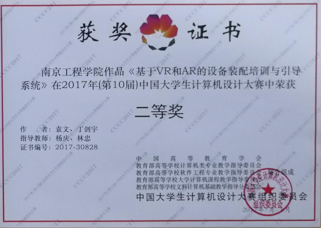 暑假期间,第十届中国大学生计算机设计大赛全国总决赛在安徽合肥举行。太阳集团计算机工程学院的袁文和丁剑宇同学在杨庆、林忠老师的指导下,制作的参赛作品《基于VR和AR的设备装配培训与引导系统》荣获了全国二等奖。
