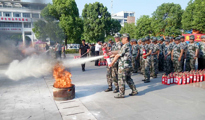 在认真听讲及观摩后,消防演练的新生分组依次体验了如何使用灭火器正确扑救火情。面对熊熊燃烧的火堆,演练人员按照灭火的步骤和方法,手提干粉灭火器,快速冲向火盆,拔出保险销,对准火源根部,压下把手,向火舌喷去,瞬时,熊熊烈火即被准确快速地扑灭。通过此次演练活动,同学们在实战中得到了锻练,也增强了安全防火意识,提高了突发应急火灾处理能力,掌握了事故发生后的逃生技巧。