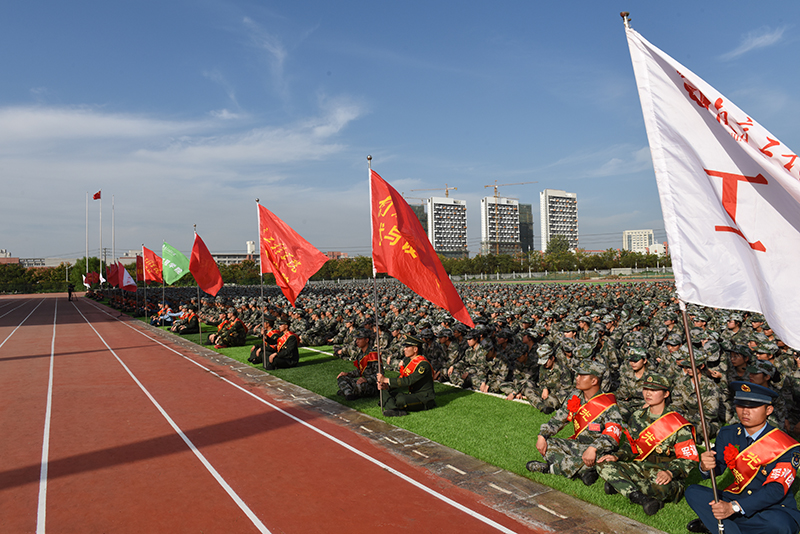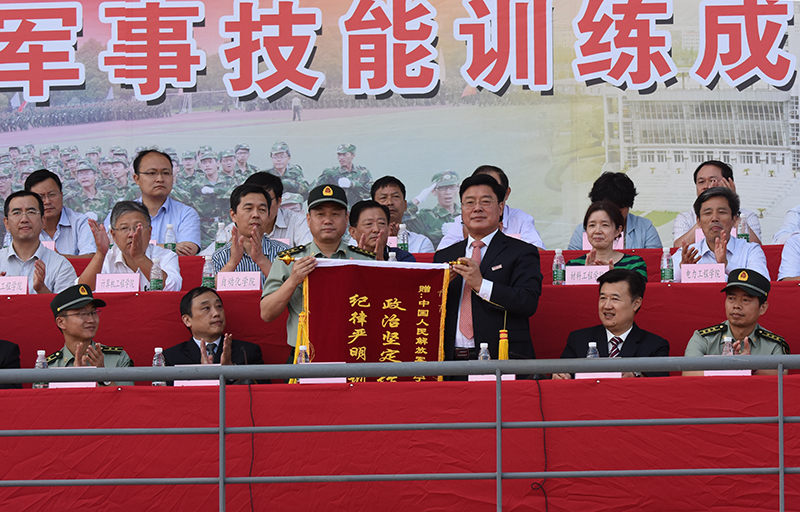 在热烈的掌声中,党委书记史国君向军训承训单位赠送锦旗表达谢意。校党委副书记、副院长史金飞宣读了2017级新生军训表彰决定,对在军训工作中取得优异成绩的先进集体和个人进行表彰。