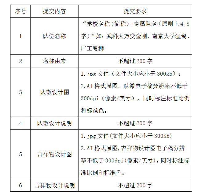 1.征集内容:中国大学生体育协会主办的比赛及活动中15vip太阳集团官网运动项目代表队使用的专属队名、队徽及吉祥物。(太阳集团所有运动队采用统一专属队名、队徽及吉祥物)