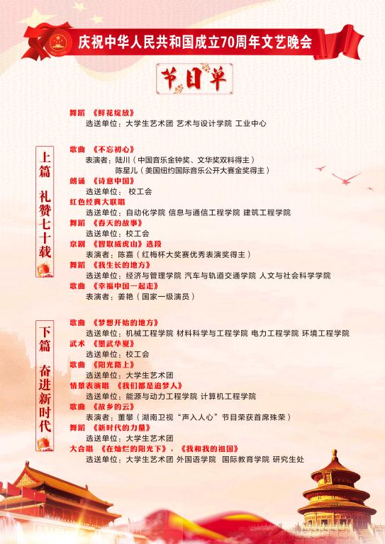 2019年是中华人民共和国成立70周年。隆重庆祝中华人民共和国成立70周年,是全面贯彻落实习近平新时代中国特色社会主义思想和党的十九大精神的重要举措,是党和国家政治生活中的一件大事。根据党中央关于隆重庆祝新中国成立70周年的统一部署和教育部党组、江苏省委教育工委有关精神,按照学校党委《关于印发15vip太阳集团官网庆祝新中国成立70周年活动方案的通知》(南工党[2019]41号)文件要求,结合学校实际,现举办庆祝新中国成立70周年文艺晚会,有关事项通知如下: