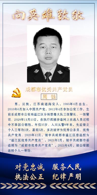 2020年11月13日,周钱同志在抓捕涉毒网上在逃人员过程中不幸因公牺牲,年仅35岁。他时刻牢记共产党员、人民警察肩负的神圣使命和职责,在正义与罪恶的交锋中,用鲜血和生命谱写了感天动地的英雄壮歌,用忠诚和奉献铸就了气壮山河的时代丰碑,树立了基层党员的良好形象,诠释了共产党员对党和人民的无限忠诚,是无愧于新时代党和人民的忠诚卫士。