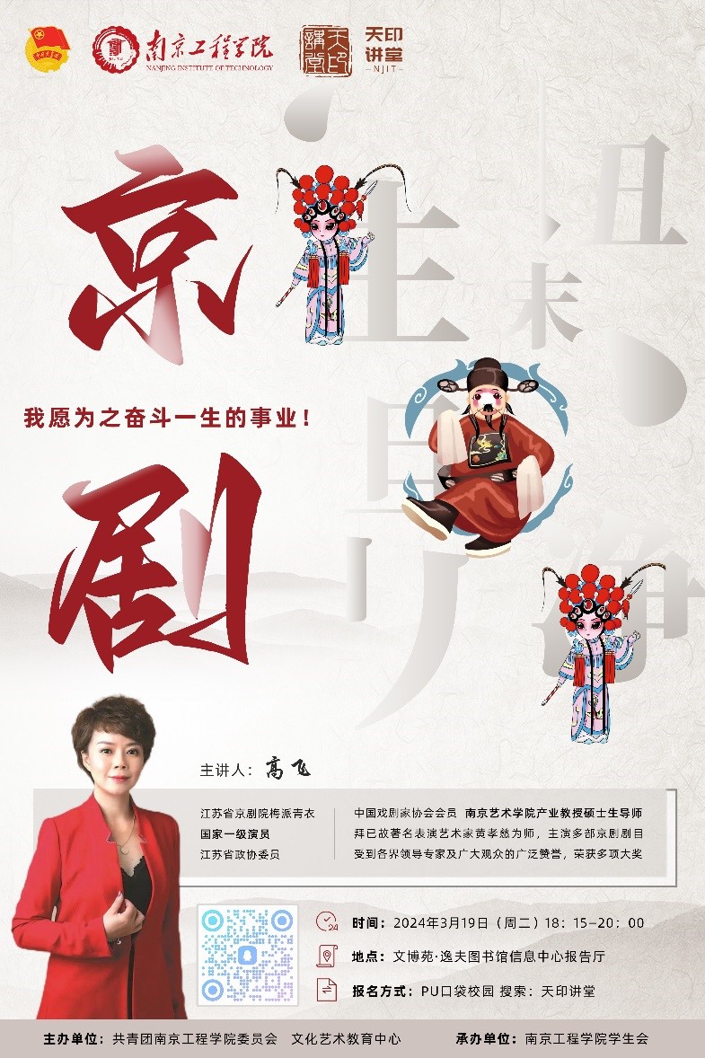 为深入学习贯彻习近平总书记关于文化传承发展的重要讲话精神,践行社会主义核心价值观,落实立德树人的根本任务,校团委推出品牌活动“天印讲堂”,本期讲堂邀请到江苏省京剧院梅派青衣高飞,现将有关事宜通知如下: