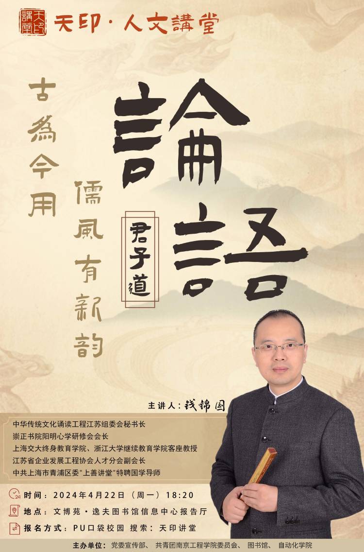 为响应党和国家建设“文化强国”的号召,弘扬中华优秀传统文化,促进文化自信自强,落实立德树人根本任务,校团委推出品牌活动“天印讲堂”,本期讲堂邀请到中华传统文化诵读工程江苏组委会秘书长、崇正书院阳明心学研修会会长钱锦国,现将有关事宜通知如下: