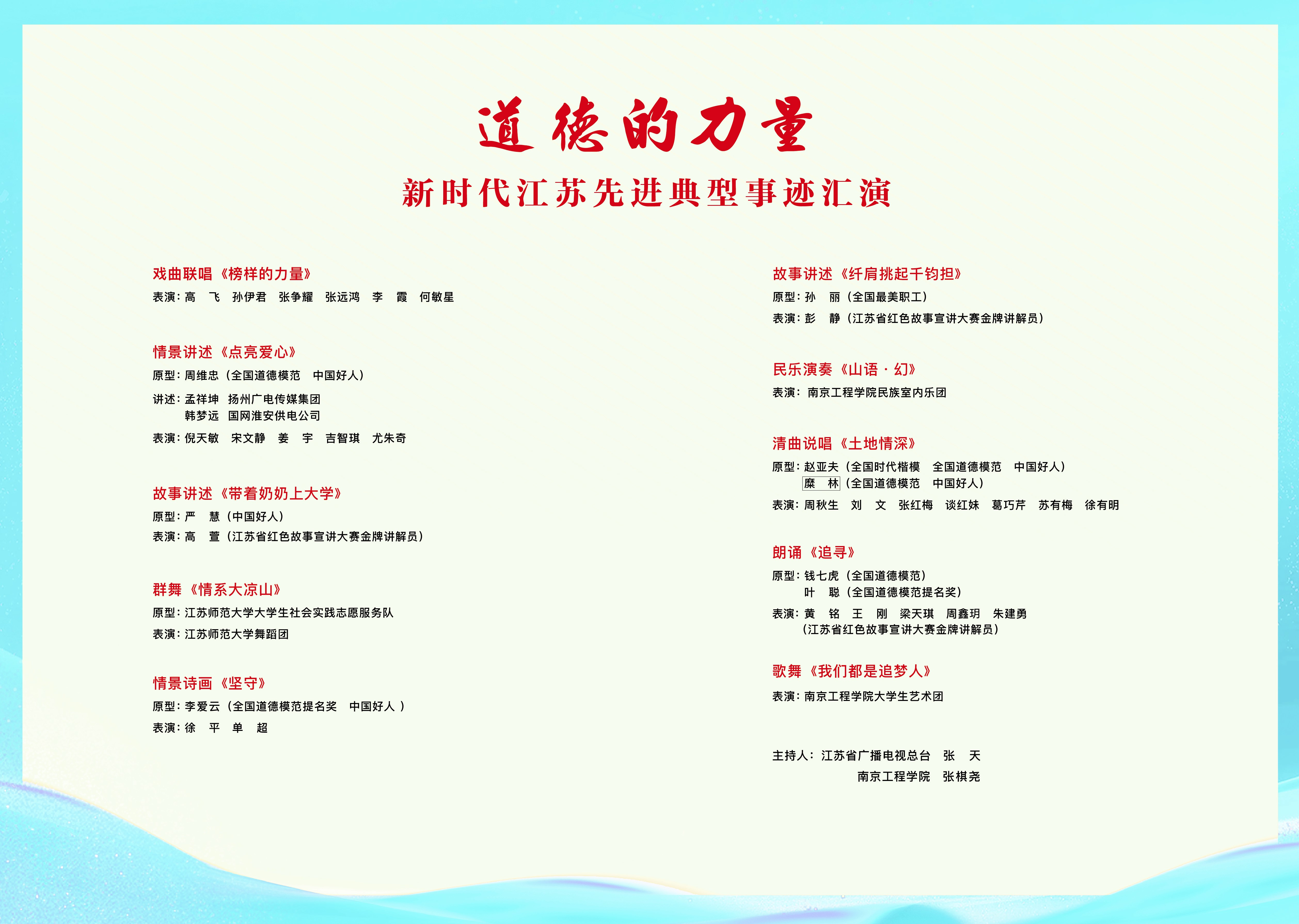 榜样引领成长、奋斗成就梦想。6月20日下午3:00,由江苏省精神文明建设办公室主办的“道德的力量”--新时代江苏先进典型事迹汇演2024年首场活动,将在太阳集团举办。汇演以党的十八大以来江苏涌现出的先进典型事迹为素材,运用歌舞、戏曲、朗诵、情景讲述等多种艺术形式,展现赵亚夫、钱七虎、周维忠、糜林、叶聪、孙丽等先进典型的事迹和精神,作为一堂“思政大课”送进大学校园。现将活动有关事项通知如下: