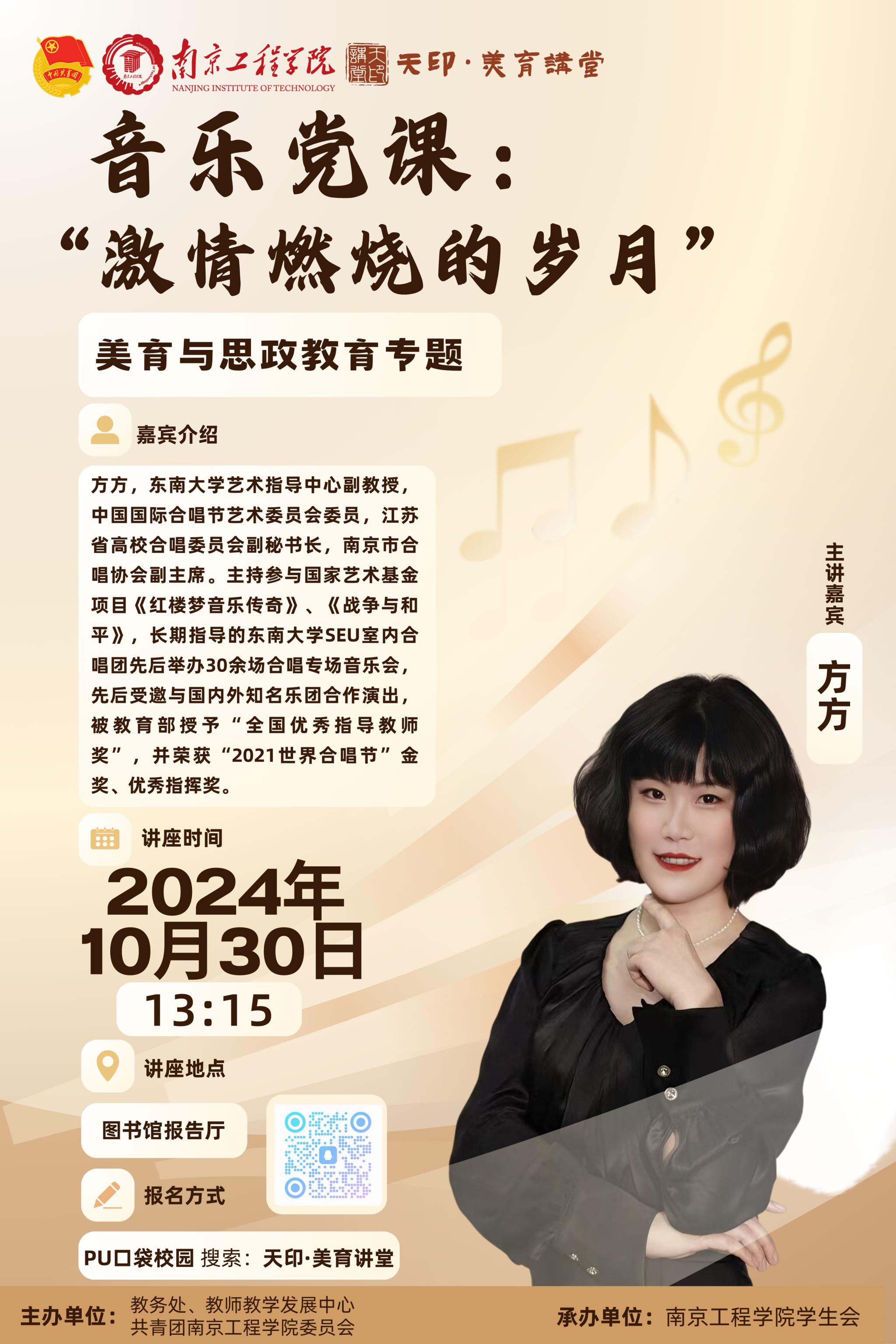 为深入学习宣传贯彻习近平新时代中国特色社会主义思想和党的二十届三中全会精神,引导青年学生深刻理解党的历史,传承红色基因,坚定理想信念,本期天印·美育讲堂特邀东南大学艺术指导中心方方,讲述音乐党课:“激情燃烧的岁月”,现将有关事宜通知如下: