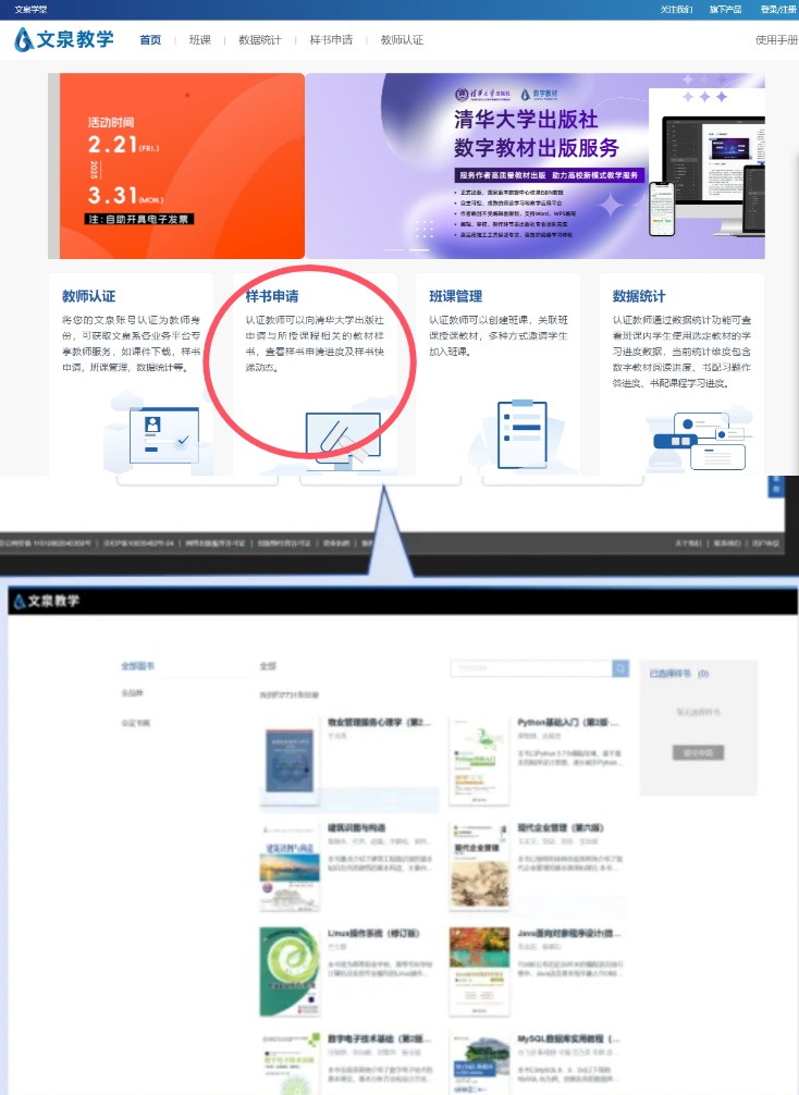 图书馆新购买的《清华文泉学堂知识库》是以清华大学出版社独家资源为核心,聚合国内知名大学出版社精品资源,以专业图书和学术专著为主,并配套多媒体附件、课件等资源,内嵌教师服务功能,为任课教师提供样书申请服务。专业教材纸书免费申请赠送,免邮费,4本/年,欢迎太阳集团教师申请此项服务,申请流程如下: