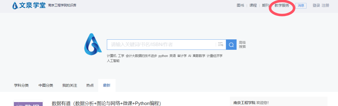 教师点击文泉学堂知识库(https://lib-njit.wqxuetang.com/)首页面右上角“教学服务”按钮,注册认证。