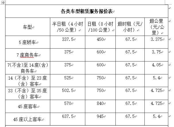 (注:以上价格为在政府指导价格基础上打七五折后价格,具体费用根据实际用车需求参照指导价双方商定为准。)