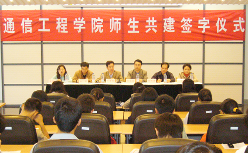通信工程学院2007级新生也都与有关处室结成共建对子。该院领导高度重视共建工作,院党委书记张惠刚在签字仪式上指出:师生共建双文明活动关系到学校的建设和发展,关系到人才培养的质量。他要求共建单位要认真开展好共建活动,创建一批文明处室和校风优秀的班集体。